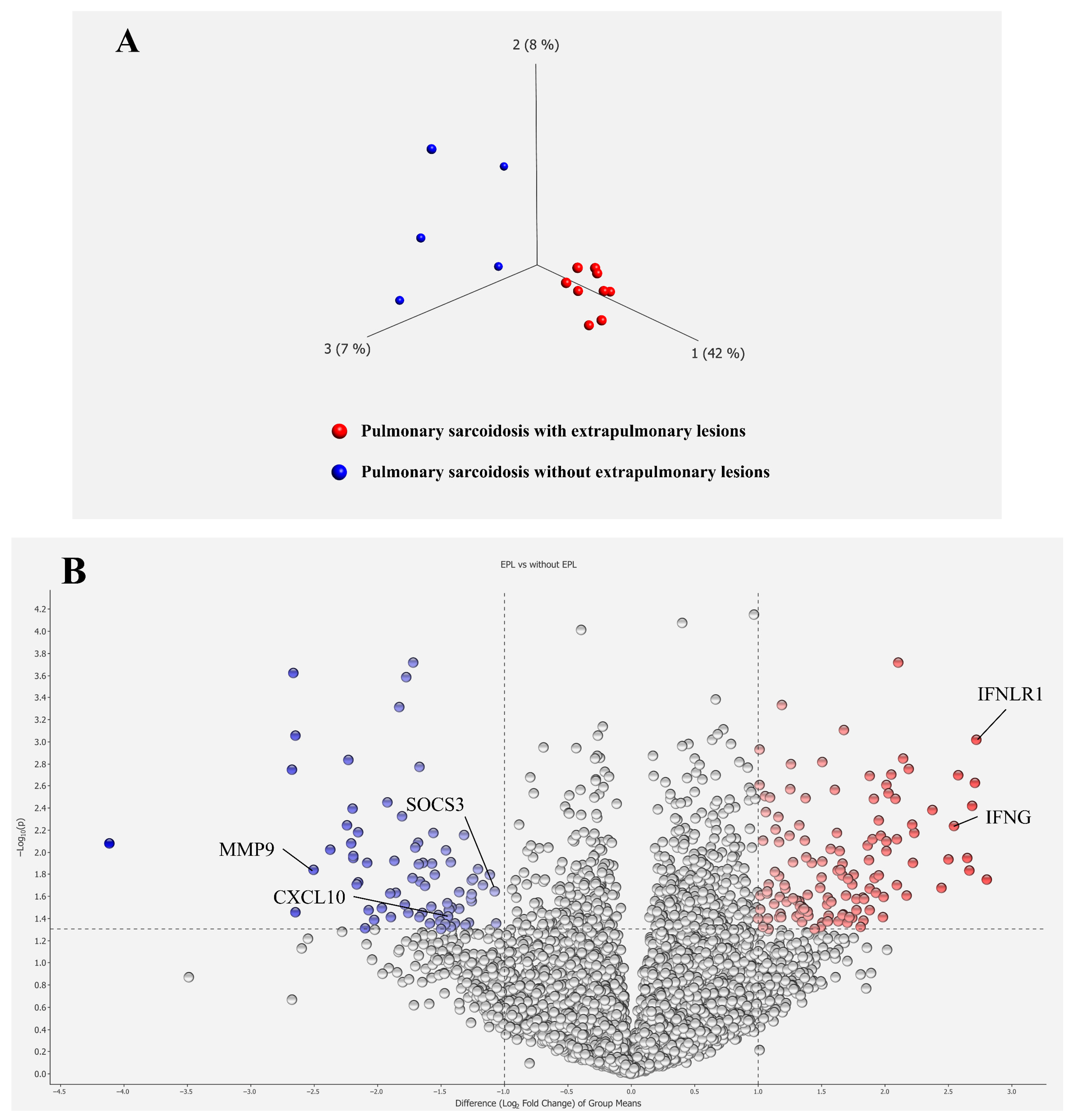 The current results revealed differential transcriptomic features of PBMCs in pulmonary sarcoidosis between patients with and without EPL, although our previous study found no transcriptomic differences between the two groups, probably due to a small sample size [