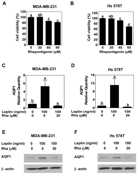 Rhapontigenin downregulated leptin-induced AQP1 expression at non-cytotoxic concentrations in TNBC cells. (A) MDA-MB-231 cells or (B) Hs 578T cells were exposed to Rha for 24 h. MTT assay was performed to determine cell viability in response to Rha. (C,E) MDA-MB-231 cells or (D,F) Hs 578T cells were treated with leptin alone or in combination with Rha for 24 h. (C,D) RT-qPCR was performed using RNA extracted from these cells. (E,F) Cell lysates were analyzed by Western blot. All data are expressed as mean ± SD from three independent experiments, Statistical analysis employed ANOVA followed by Tukey’s post hoc tests for multiple group comparisons. Different letters on the graph indicate statistically significant differences between groups.