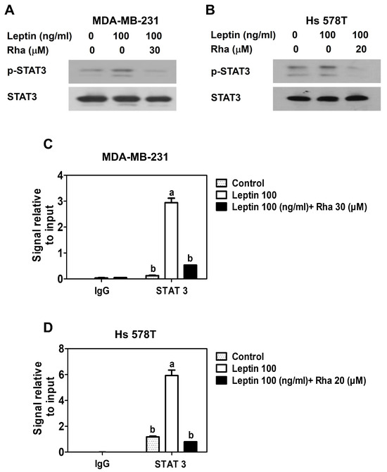 To demonstrate that the effects of Rha observed in this study were not due to cytotoxicity, a non-toxic concentration was established through cell viability experiments in MDA-MB-231 cells (Figure 1A) and Hs 578T cells (Figure 1B), and subsequent experiments were conducted accordingly. RT-qPCR and Western blot analyses revealed that Rha downregulated leptin-induced AQP1 mRNA (Figure 1C,D) and protein (Figure 1E,F) levels at nontoxic concentrations. Therefore, this inhibition appears to be due to the disruption of a specific pathway rather than cytotoxic stress, highlighting AQP1 as a functional downstream target of Rha and supporting the hypothesis that Rha effectively disrupts this signaling axis. To elucidate the underlying mechanism, Western blot analyses were performed to determine the effect of Rha on the STAT3 signaling pathway. The overexpression and constitutive activation of STAT3 play critical roles in cell survival, progression, metastasis, and chemoresistance in TNBC. Several cytokines and growth factors activate STAT3 via phosphorylation [40]. Leptin-activated STAT3 signaling is well known to promote the growth and progression of breast cancer [41]. Consistent with recent results [13], Western blot revealed that leptin triggered STAT3 phosphorylation in TNBC cells. However, Rha effectively suppressed this phosphorylation without altering the total level of STAT3 (Figure 2A,B), suggesting that Rha selectively inhibits STAT3 activation rather than reducing STAT3 expression. Phosphorylated STAT3 forms STAT3 dimers, which then translocate from the cytoplasm to the nucleus, where they bind to specific DNA sequences in target gene promoters and act as an oncogenic transcription factor [40,42]. After confirming that Rha downregulated AQP1 expression at the transcriptional level (Figure 1C,D), a ChIP assay was performed to determine whether STAT3 bound to the AQP1 promoter. Figure 2C,D showed that leptin significantly enhanced the DNA-binding activity of STAT3 to the AQP1 promoter, which was suppressed by Rha treatment. This indicates that the leptin-STAT3 axis regulates AQP1 expression and that Rha interferes with this transcriptional regulation. These findings are consistent with previous studies that identified phosphorylated STAT3 as a central regulator of tumor-promoting gene expression in TNBC [43].