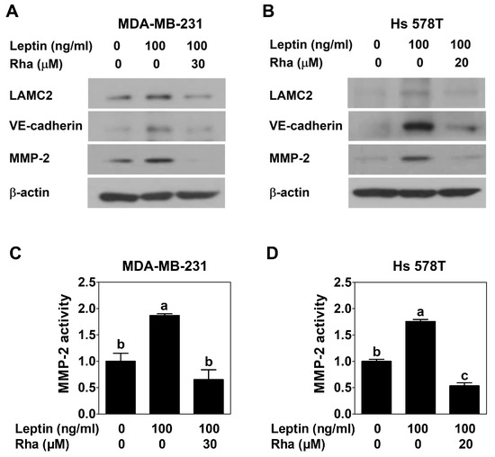 To demonstrate the role of Rha in invasion- and VM-related proteins, TNBC cells were treated with leptin alone or in combination with Rha for 24 h and Western blot analysis was performed. LAMC2, VE-cadherin, and MMP-2 protein expression was upregulated by leptin treatment alone. In contrast, Rha co-treatment markedly reduced the expression of these proteins in both TNBC cell lines (Figure 5A,B). Additionally, MMP-2 enzymatic activity was measured in the conditioned medium from cells treated with leptin alone or in combination with Rha for 24 h using a commercial activity assay kit. MMP-2 activity was significantly elevated following leptin treatment, whereas Rha effectively suppressed this increase in both TNBC cell lines (Figure 5C,D). These results indicated that Rha inhibits leptin-induced invasion and VM in both TNBC cell lines by reducing the expression and activity of invasion- and VM-related proteins.