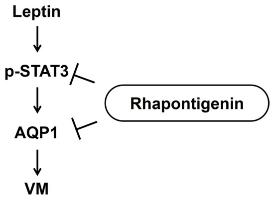 This study provided the first evidence that Rha suppresses VM in TNBC cells by inhibiting leptin-induced STAT3 activation and AQP1 expression (Figure 6). This disruption of VM has been attributed to a reduction in invasion- and VM-associated proteins, ECM remodeling, and invasive behavior. These results highlight the therapeutic relevance of targeting the leptin–STAT3–AQP1 axis and suggest that Rha is a promising candidate for treating patients with TNBC, particularly in the context of obesity. However, further studies are needed, including an evaluation the VM-inhibiting activity of Rha using animal models and an evaluation of the efficacy of combination therapy with anti-angiogenic agents. By interfering with multiple essential steps in VM formation, Rha offers a novel strategy for overcoming leptin-induced aggressiveness and resistance to conventional anti-angiogenic therapies.