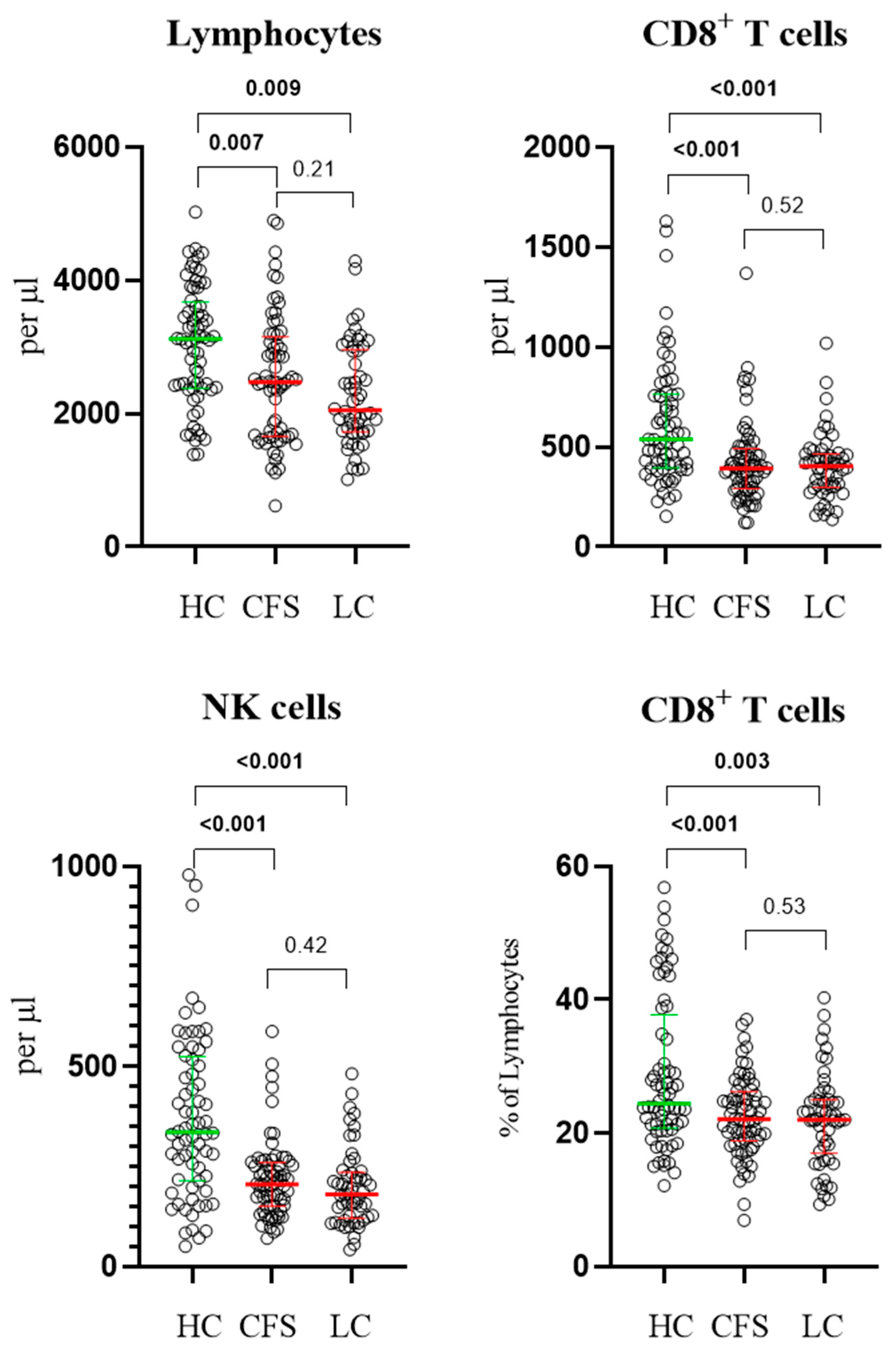 This study has several limitations. First, the control group was younger than the patient groups, which may have influenced immune parameters despite statistical adjustments for age. Second, the cross-sectional design precludes any conclusions about causality between immune alterations and disease status. Third, although most comparisons were adequately powered, the sample sizes for some subgroup analyses, such as ME/CFS versus LC, were relatively small, and subtle differences may have been missed due to limited statistical power (risk of Type II error). We also acknowledge that laboratory assay variability may have influenced some biomarker measurements, despite standardized procedures. Future studies using harmonized protocols across multiple centers are needed to validate and extend these findings. These limitations should be considered when interpreting the results, and future studies with larger, age-matched cohorts and longitudinal designs are warranted.