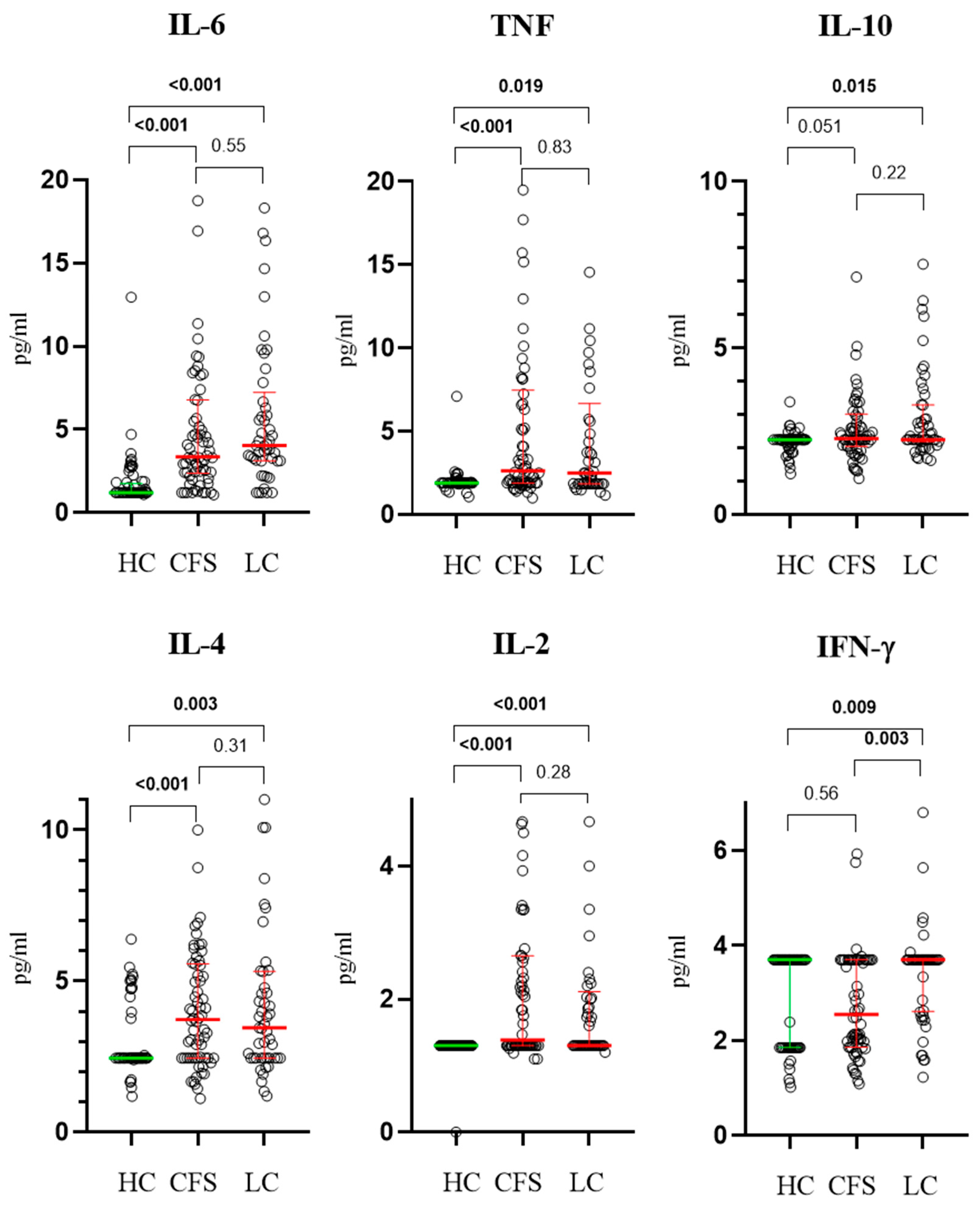 GraphPad Prism software ver. 8.0. was used for statistical data processing. Normality of data distribution was assessed using the Shapiro–Wilk test. For non-normally distributed data, results are presented as median with Q1–Q3 ranges. Analyses included the Kruskal–Wallis test for age, Chi2 test for sex distribution and Spearman’s correlation. To account for differences in age between groups, we performed rank-transformed ANCOVA: outcome values were rank-transformed and entered into a general linear model with group as the main factor and age as the covariate. For multiple comparisons, we applied the False Discovery Rate (FDR) correction using the Benjamini–Hochberg algorithm. FDR correction was performed separately for each family of related tests (e.g., all cytokines measured in sera). Post hoc power analyses were performed and indicated that all parameters had sufficient statistical power (≥0.8) to detect the observed differences. These analyses support the study being adequately powered for the detected effects, although subtle differences between ME/CFS and LC groups cannot be completely ruled out. Adjusted p-values below 0.05 were considered statistically significant.