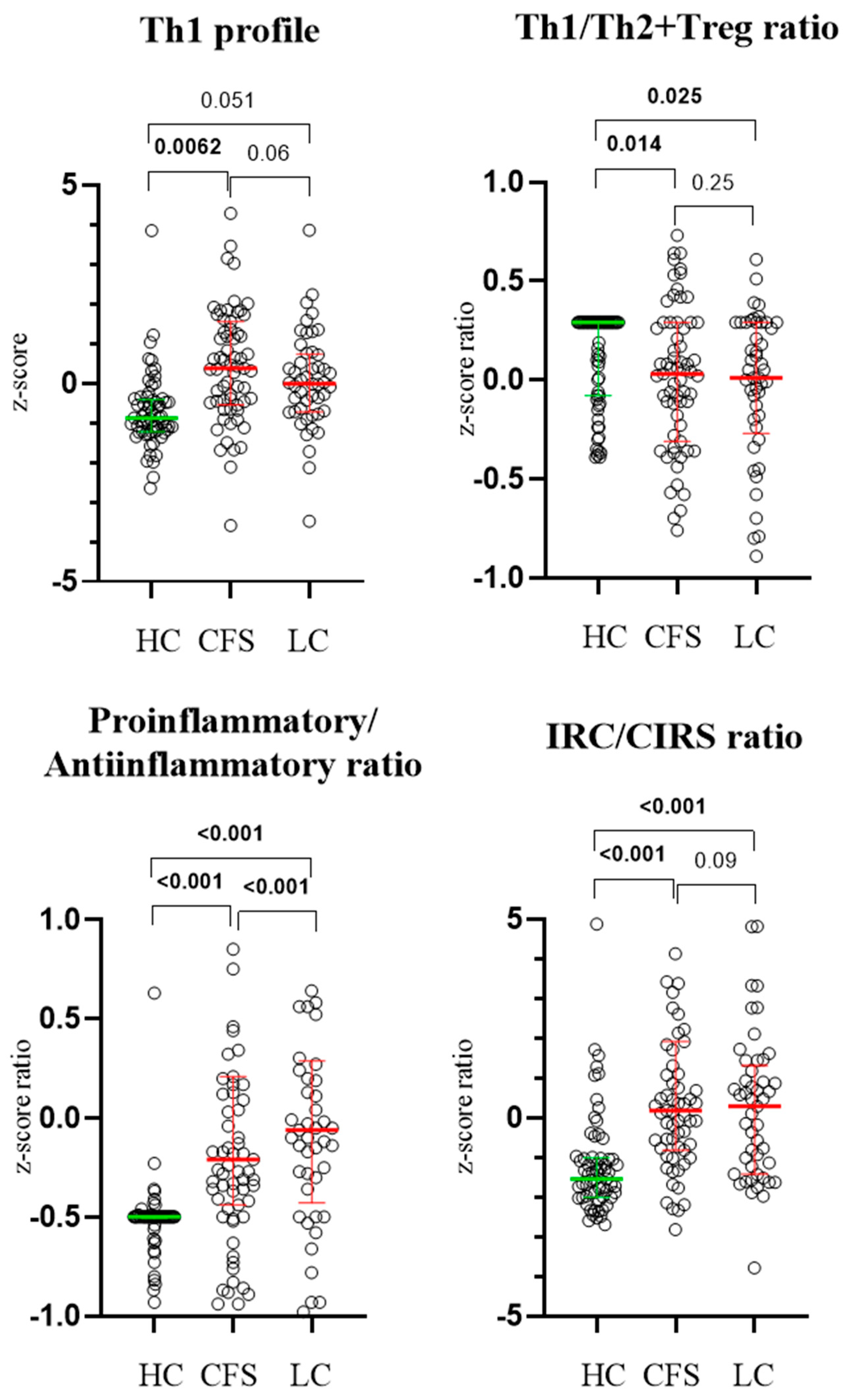 83]. The Th1 skewed immune response, involving IRS in the ME/CFS and LC patients in our study, might be a result of a more acute stage of the syndrome. Conducting longitudinal studies where disease stages are correlated with cytokine production is important to prove this theory. The observed altered Th1/Th2 + Treg ratio suggests not only an inflammatory Th1 response, but also a possible dysfunction of Tregs, which are essential for maintaining immune tolerance and preventing autoimmunity [