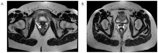 T2-weighted MRI scan in the axial plane showing rectal cancer before (A) and after nCRT (B), white arrows showing tumor bed. On the left, there is the lesion with its typical intermediate signal intensity, while on the right, a drop in the signal intensity is shown, caused by therapy-induced fibrosis.