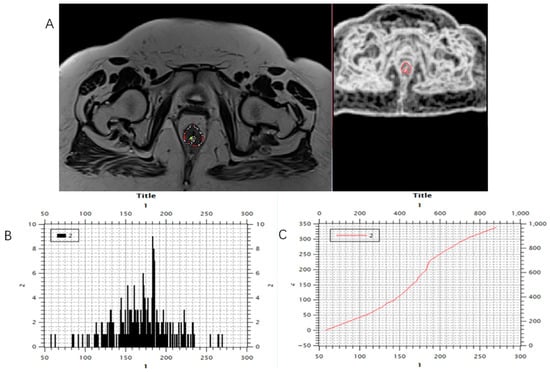 Using software MIPAV (Medical Image Processing, Analysis, and Visualization) version 11.3.2, developed by the National Institutes of Health, Bethesda, MD, USA, histogram analysis was performed on both MRI examinations. All tumor segmentations were performed by a board-certified GI radiologist with 8 years of experience in rectal cancer imaging, blinded to pathological results. Segmentation was performed on T2-weighted axial sequences with regions of interest manually drawn on each slice containing visible tumor while carefully excluding surrounding fat, mesorectal fascia, and bowel lumen. It is followed by volume of interest (VOI) creation and automatically histogram parameter calculation (Figure 3, Figure 4 and Figure 5). The following 7 histogram parameters were measured: mean (average pixel intensity value in the region), standard deviation (measure of pixel intensity variation), median (middle pixel intensity value), kurtosis (measure of distribution “peakedness”), skewness (measure of pixel distribution asymmetry), and 5th and 95th percentiles (markers of distribution extremes). Other than the above-mentioned, other measured morphological, functional, and volumetric parameters are beyond the scope of this study.