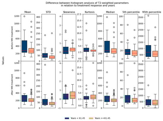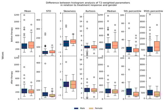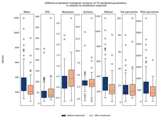 The T2-weighted histogram analysis contained seven parameters: mean, std, skewness, kurtosis, median, 5th percentile, and 95th percentile. We observed all seven parameters in relation to treatment response. It can be noted that the mean value, median, and 95th percentile show statistically significant differences in relation to treatment response when we observe all patients (responders and non-responders) together (Figure 6).