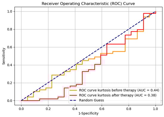 The Receiver Operating Characteristic (ROC) curve, with the Youden index used for selecting the optimal cutoff point, for kurtosis before and after therapy, demonstrates the results that are lower compared to random classification (Figure 9). However, such outcomes are not uncommon in the context of imbalanced datasets (responders—22, non-responders—49, ratio 1:2.2). This phenomenon can occur because the ROC metric may be less robust in scenarios where class distributions are highly skewed; it gives equal weight to both classes regardless of their prevalence; therefore, it is suboptimal for visual representation. The evaluation metrics for the classification of responders and non-responders, both before and after therapy, are shown in Table 2. Notably, the F1 score, as a metric that accounts for imbalanced data, indicates an improvement in classification performance following therapy. This suggests some degree of effective differentiation between responders and non-responders, even though it is not seen on the ROC curve.
