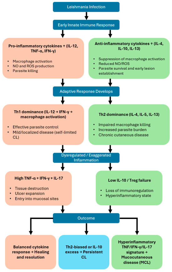 Cytokine-driven immunological pathways determining clinical outcomes in cutaneous and mucocutaneous leishmaniasis. This flowchart illustrates how cytokine responses shape the progression and clinical manifestations of Leishmania infection.