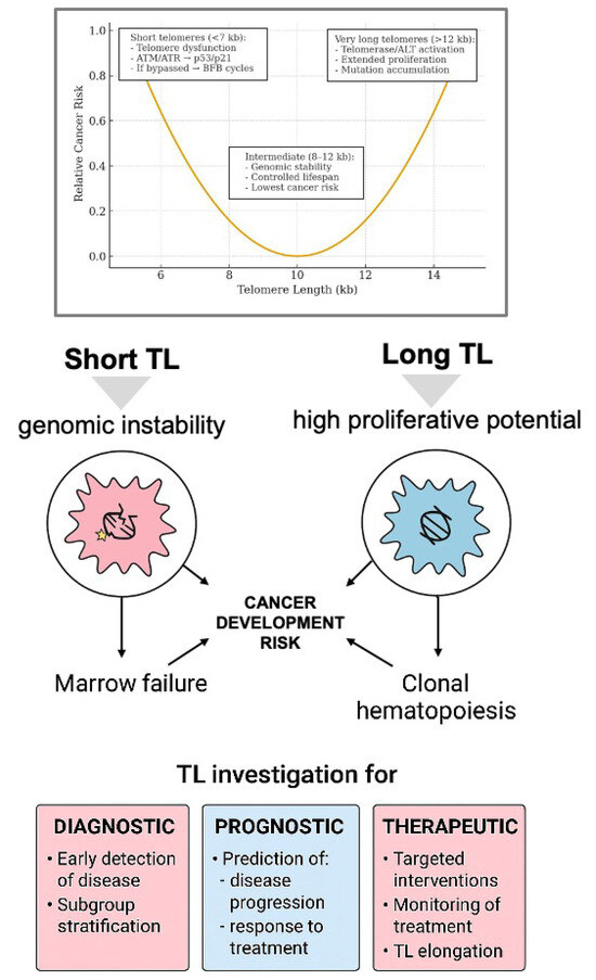 Role of telomere in cancer development and the value of telomere length assessment. Conceptual model illustrating the non-linear relationship between telomere length (TL) and cancer risk. Extremely short TL (<~7 kb) triggers the complex DNA damage response (DDR), involving the ATM/ATR pathway leading to cell arrest and apoptosis mediated by activated p53 and p21. If the DDR process is severely compromised, short TL drives genomic instability, with Breakage-Fusion-Bridge (BFB) cycles, that favor the initiation and progression of cancer cells. On the other hand, excessively long TL (>~12 kb) supports extended proliferative potential and clonal evolution, again increasing malignant transformation risk. Intermediate TL (8–12 kb) maintains controlled proliferation and genomic stability, associated with the lowest cancer risk. Below, a schematic representation highlights the clinical consequences of short and long TL: basically, dysfunctional TL may lead to increased cancer risk; in addition, short TL predisposes one to bone marrow failure, while long TL favors clonal hematopoiesis. Both these features may ultimately end up in cancer development. Due to the marked involvement in carcinogenesis, TL assessment has diagnostic value (early disease detection and patient stratification), prognostic utility (prediction of disease progression and treatment response), and therapeutic relevance (monitoring of telomere-targeted interventions and potential TL elongation strategies). Image editing was assisted by ChatGPT [36] and broadly adapted by the authors.