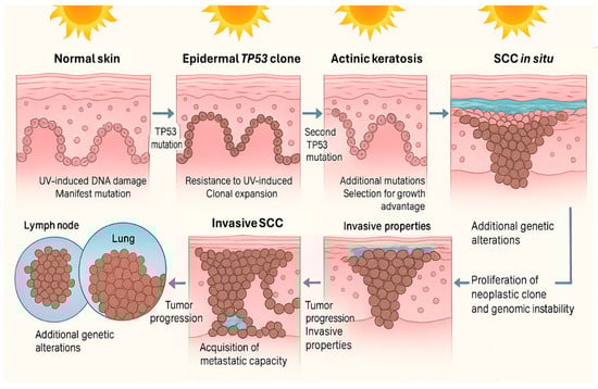 cSCC arises through the convergence of environmental injury, impaired immune surveillance, and inherited or acquired genomic alterations that together drive a multistep carcinogenic process from actinic keratosis to invasive disease (Figure 3) [24,25,26,27].