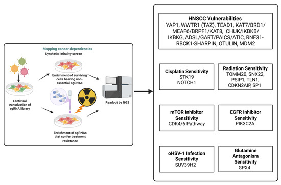 Goto et al. used similar approaches but focused on sensitizing the mTOR inhibitor (mTORi) in OSCC by combining it with targeting agents to suppress resistance pathways [18]. Their group performed a kinome-wide CRISPR Cas9 dropout (loss-of-function) screen in tongue SCC cells post-treatment of INK128 (mTOR inhibitor) to identify genes whose loss enhances mTOR-inhibitor-killing activity. The CRISPR screen was designed as a dropout (loss-of-function) assay, in which sgRNA depletion over time indicated reduced proliferative fitness rather than direct cytotoxicity. The authors selected the second most regulated pathway that relates to the cell cycle pathway as the synthetic-lethal partner for mTORi and demonstrated the synergistic killing activities between the CDK4/6 inhibitor palbociclib and INK128 in both in vitro and in vivo preclinical models. Mechanistically, their study revealed that inhibition of mTOR led to suppression of eIF4G-CCNE1 mRNA complex formation, inhibiting CCNE1 translation and thereby preventing the adaptive CCNE1 level increase that drives rapid resistance to palbociclib. This result reveals the potential of using CRISPR Cas9 screening to identify rational combination treatments for HNSCC. Overall, growth inhibition was demonstrated in both in vitro and in vivo models, as evidenced by BrdU staining, and no apoptotic assays such as cleaved PARP, caspase-3, or TUNEL were performed. Similarly, Wang et al. [19] performed a kinase-related CRISPR Cas9 library screen to identify vulnerabilities that could sensitize HNSCC cells to EGFR inhibition using erlotinib and gefitinib, which constitute the second generation of EGFR inhibitors, while cetuximab represents the first generation of EGFR inhibitor approved for HNSCC treatment. They identified PIK3C2A as the only gene that depleted both gefitinib and erlotinib levels, and transient knockdown of this gene using an siRNA approach sensitized HNSCC cells to gefitinib treatment in vitro. As PIK3C2A pharmacological inhibitors are still underdeveloped, the authors were unable to perform a downstream study to validate the mechanistic link between PIK3C2A depletion and EGFR pathway inhibition. Moving beyond efforts to optimize mTOR or EGFR-targeted strategies for HNSCC, Qiu et al. [21] employed genome-wide CRISPR Cas9 screening to uncover vulnerabilities that enhance responsiveness to oncolytic virotherapy with oHSV-1. They identified the H3K9 methyltransferase SUV39H2 as a key host factor conferring resistance. They demonstrated that genetic depletion or pharmacologic inhibition with OTS186935 increased expression of viral genes (ICP0/ICP4/ICP8) and enhanced viral yield in vitro. In their in vivo study, they combined oHSV-1 with OTS186935 in an immunocompromised-cell-derived xenograft subcutaneous mouse model and found that this combination therapy enhanced anti-tumor efficacy relative to oHSV-1 or an untreated control. Mechanistically, SUV39H2 inhibition reduced H3K9me3 levels and elevated ICP8 levels, facilitating viral replication. To assess immune effects, the authors knocked down SUV39H2 in a syngeneic HNSCC line and treated tumors with oHSV-1. They demonstrated that SUV39H2 loss enhanced oHSV-1 anti-tumor activity and increased intratumoral CD4 and CD8 T-cell infiltration. As cancer cells depend on metabolism to fuel proliferation and confer therapy resistance, numerous studies have begun focusing on inhibiting glutamine metabolism [25]. Recently, Allevato et al. [20] performed a genome-wide CRISPR screen of HNSCC to define mechanisms of resistance to glutamine inhibition and found that GPX4 inhibition via RSL3 sensitized cells to glutamine antagonists or inhibitors (DON) in vitro and in vivo, highlighting the synthetic lethality between glutaminase inhibition with GPX4 inhibition as a promising therapeutic strategy for HNSCC. Collectively, treatment-perturbation screens using targeted therapies such as mTOR inhibitors, EGFR inhibitors, glutamine inhibitors, and oHSV-1 have demonstrated the potential of synthetic-lethal approaches to treating HNSCC by mechanistically targeting mTOR signaling and cell-cycle regulation (INK128–palbociclib synergy), EGFR–PI3K pathway cross-talk (PIK3C2A-mediated TKI resistance), metabolic dependency on glutamine and ferroptosis regulators (GPX4), and epigenetic modulation of viral susceptibility via SUV39H2. Their success in overcoming resistance to these targeted therapies through the use of pharmacological inhibitors or genetically modified approaches provides a rationale for combination strategies in the HNSCC setting.