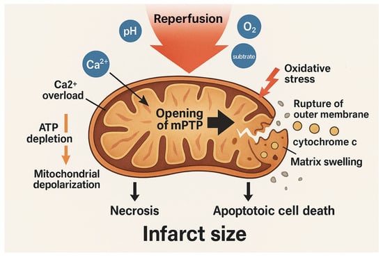 CMs are the primary targets of reperfusion injury following myocardial infarction. During ischemia, ATP depletion and ionic imbalance cause intracellular Ca2+ accumulation, predisposing cells to damage upon reperfusion linked to the mPTP phenomenon. Restoration of blood flow triggers a burst of ROS and abrupt pH normalization, which exacerbates oxidative stress and mitochondrial dysfunction. A pivotal event of mPTP opening leads to loss of membrane potential, ATP collapse, and cell death through necrosis or apoptosis. Simultaneously, Ca2+ overload combined with renewed ATP availability induces hypercontracture, resulting in contraction band necrosis. Furthermore, cardiomyocytes release damage-associated molecular patterns (DAMPs), amplifying inflammation and contributing to adverse remodelling [58,59]. Collectively, these processes may account for up to 50% of the final infarct size despite successful reperfusion, highlighting the urgent need for targeted cardioprotective strategies.