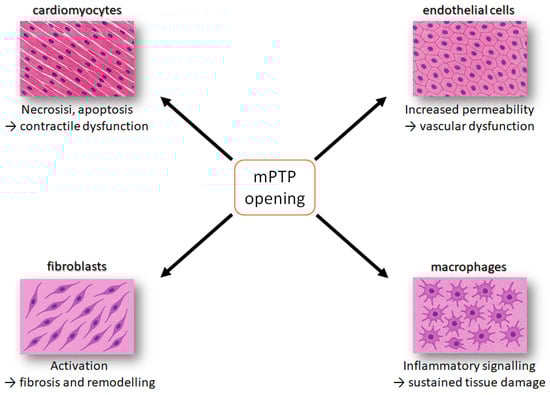 Schematic overview of how mitochondrial permeability transition pore (mPTP) opening affects major cardiac cell types. In cardiomyocytes, mPTP opening induces necrosis and apoptosis, leading to contractile dysfunction. In endothelial cells, it increases permeability, causing vascular dysfunction. In fibroblasts, it promotes activation and extracellular matrix deposition, driving fibrosis and remodelling. In inflammatory cells, it enhances pro-inflammatory signalling, resulting in sustained tissue damage. Together, these pathways contribute to progressive myocardial injury. The orange square indicates the event of mPTP opening, while the arrows refer to the phenomenon occurring in the different cell lines.