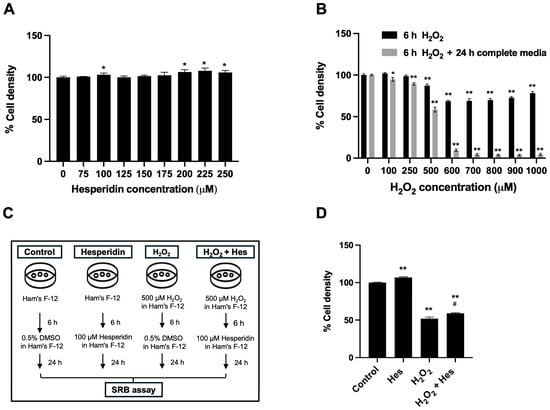 Effects of H2O2 and hesperidin on HK-2 cell density measured by SRB assay. All data are presented as mean ± SD of the percent cell density normalized to untreated control cells, calculated from OD540 values obtained from the SRB assay. (A) Cytotoxicity of hesperidin on HK-2 cells. Cells were treated with 0–250 µM hesperidin for 24 h (n = 3 per group), based on two independent experiments. (B) Cytotoxicity of hydrogen peroxide. HK-2 cells were treated with 0–1000 µM H2O2 for 6 h (black bars) or treated for 6 h followed by recovery in complete medium for 24 h (gray bars) (n = 3 per group), based on three independent experiments. (C) Schematic diagram of experimental treatment conditions: untreated control, 100 µM hesperidin (Hes), 500 µM H2O2, and co-treatment with H2O2 followed by hesperidin (H2O2 + Hes). (D) Comparison of cell density among treatment groups (n = 3 per group), based on three independent experiments. Statistical analysis was performed using an independent Student’s t-test. * p-value ≤ 0.05 compared to control. ** p-value ≤ 0.001 compared to control. # p-value ≤ 0.05 compared to the H2O2-treated group.