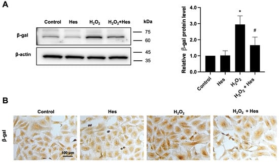 Effects of hesperidin on β-galactosidase protein expression levels detected by Western blot analysis and immunocytochemistry in oxidatively damaged HK-2 cells induced by H2O2. (A) Relative fold changes in protein expression level of β-galactosidase (β-gal) normalized by β-actin (n = 3 per group). kDa represents kilodalton. (B) Immunocytochemistry staining results of β-galactosidase. Statistical analysis was performed using an independent Student’s t-test. * p-value ≤ 0.05 compared to control. # p-value ≤ 0.05 compared to the H2O2-treated group.