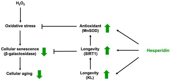 In summary, hesperidin enhanced the viability of HK-2 cells following oxidative stress-induced injury. Its ability to reverse oxidative damage appears to be mediated through multiple molecular mechanisms, including the upregulation of KL and SIRT1, and the suppression of senescence-associated β-galactosidase expression. Additionally, hesperidin improved the antioxidant defense system by upregulating MnSOD expression, a key mitochondrial enzyme responsible for neutralizing ROS (Figure 4). These findings suggest that hesperidin, a naturally occurring plant-derived flavonoid, may partially reverse oxidative damage and modulate longevity and stress-response pathways in kidney cells. Although the degree of recovery observed was modest, this study provides a promising foundation for considering hesperidin as a potential adjunctive agent to delay CKD progression. Further investigations, including dose–response studies, long-term exposure analysis, and validation in animal models or clinical settings, are warranted to fully elucidate its therapeutic potential and optimize its application.