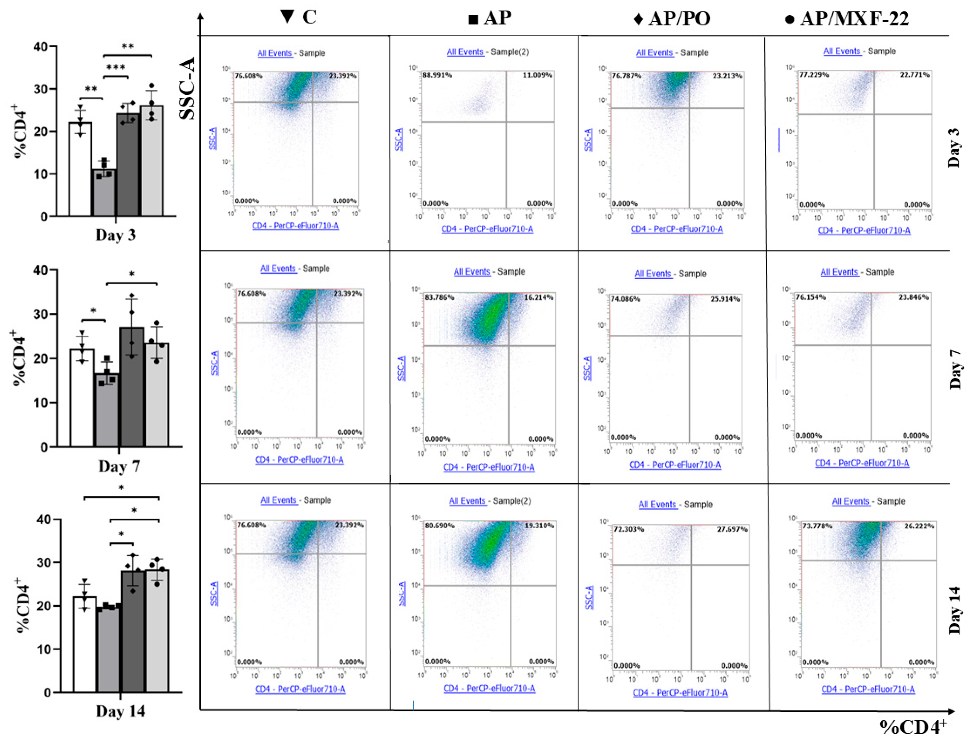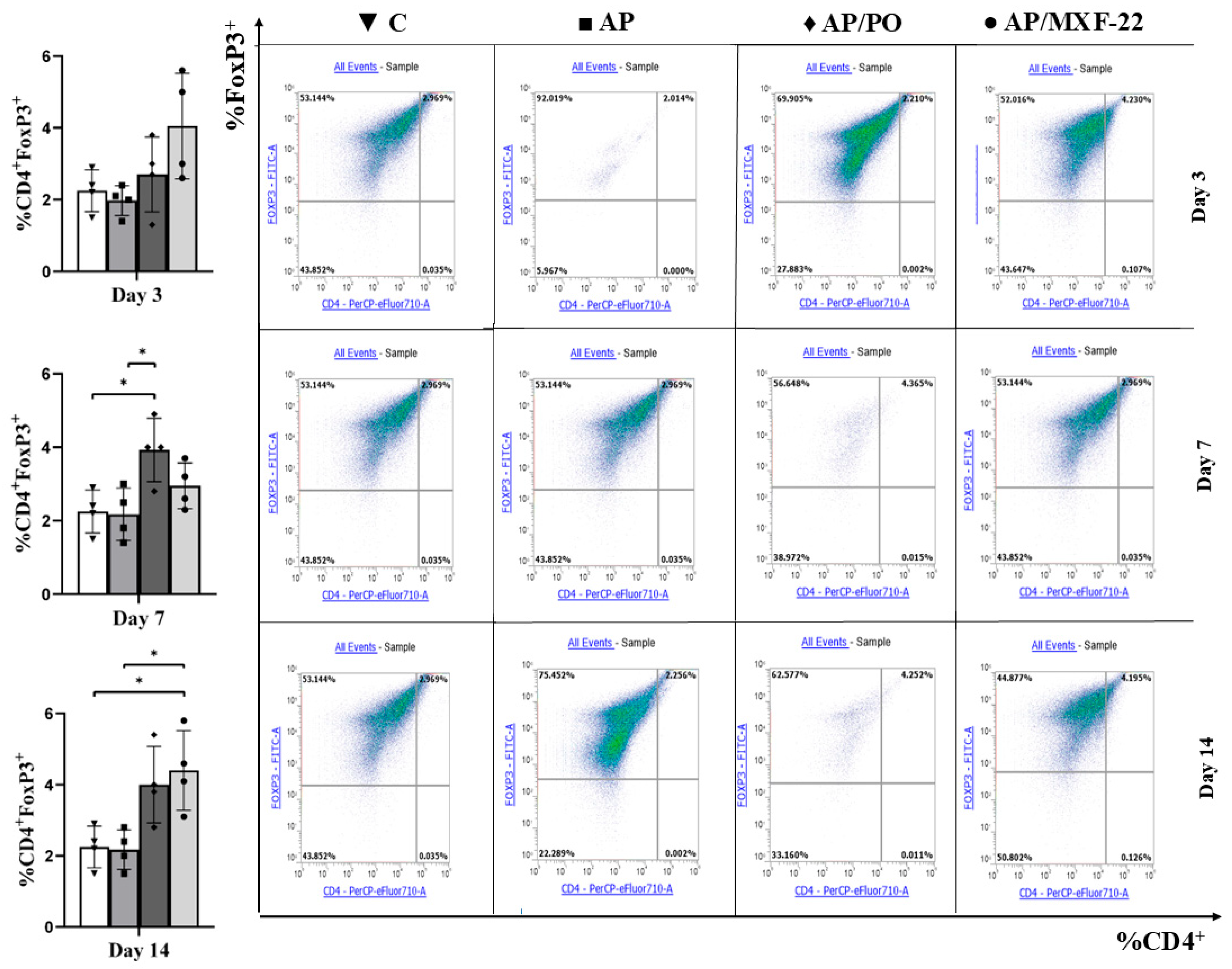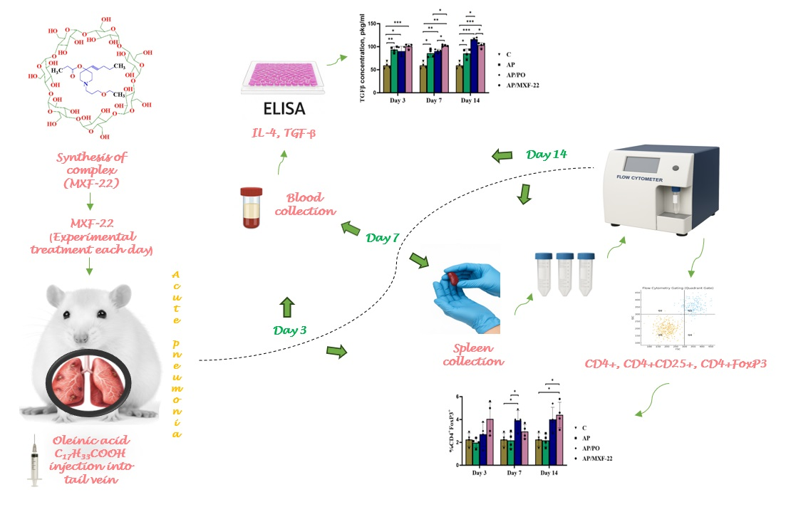 - The markers were determined using flow immunocytofluorometry. For this purpose, the cell suspension was treated with monoclonal antibodies to surface markers, according to the manufacturers’ protocols. The sample was preparation and staining of splenocytes for flow cytometry. The spleen (approximately 0.5 × 2 cm in size) was placed in 0.5 mL of cold physiological saline. After that the homogenized tissue was mixed with 4.5 mL of cold solution, filtered through a nylon filter (70 μm), and centrifuged at 400 G for 5 min, then the supernatant was carefully removed with a pipette. Lysis of erythrocytes was performed by 10 min incubation of the cells in 2 mL of High-Yield Lyse reagent, with preliminary mixing of the solution, splenocytes were in solution, the liquid was carefully taken into micro-samples, without affecting pieces of tissue, large fragments of suspension, and other elements of the solution. Then, cells were washed two times in physiological saline and resuspended in 100 μL of cold solution. Centrifugation was carried out at 300 RCF for 5 min with the addition of 1.5 mL of 0.9% saline solution. Surface staining was performed using monoclonal antibodies against the respective markers according to the manufacturer’s protocol. A mixture of antibodies was added to the prepared cell suspension: 60 μL of anti-CD4 and 30 μL of anti-CD25 antibodies diluted in 810 μL of 0.9% saline. The sample was thoroughly mixed and incubated for 30 min at +4 °C in the refrigerator. The fixation/permeabilization solution was prepared by mixing 15 mL of FoxP3 fixation/permeabilization concentrate with 45 mL of FoxP3 fixation/permeabilization diluent. Cells were incubated for 30 min at room temperature in the dark. To prepare the permeabilization buffer, 5.1 mL of 10× Permeabilization Buffer was diluted in 45.9 mL of distilled water. Cells were washed three times followed by centrifugation at 500 RCF for 5 min, after which the supernatant was removed. A mixture of antibodies for intracellular staining was added to the pellet and mixed thoroughly. The intracellular antibody mixture was prepared by adding 90 μL of anti-FoxP3 to 810 μL of saline. Then, 15 μL of this antibody solution was added to each sample. Samples were incubated at room temperature for 30 min. Next, 1.5 mL of 1× Permeabilization Buffer was added, followed by centrifugation at 400 RCF for 5 min, and the supernatant was removed. Finally, 500 μL of 0.9% saline was added, and the pellet was resuspended by vortexing or pipetting. The samples were analyzed using a flow cytometer. Following staining, cells were washed, fixed, and resuspended in 500 µL of 0.9% saline. Non-specific fluorescence was assessed using fluorescence-minus-one (FMO) controls.