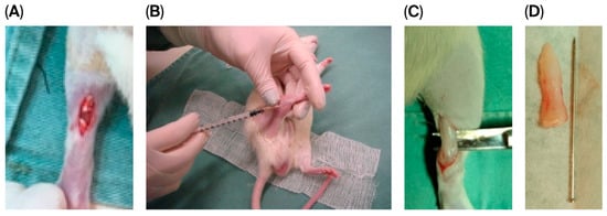 The rats were anesthetized intraperitoneally with 5% ketamine hydrochloride (VetanarcolTM, Konig do Brazil Ltd., Mairinque, Brazil) at a dose of 80 mg/kg and combined with 2% xylazine hydrochloride (RompunTM, Bayer S.A., São Paulo, Brazil) at a dose of 10 mg/kg. Once anesthesia was achieved, as verified by pupillary reflex and muscle relaxation, the surgical site was shaved, and tenotomy was performed, as demonstrated in Figure 1A.