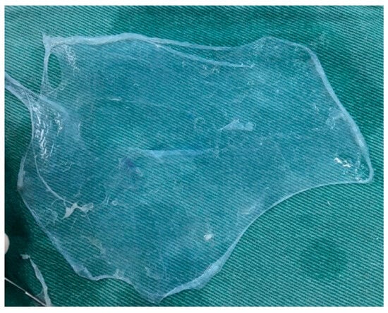 Decellularization of the AM was performed by removing amniotic epithelial cells from the membrane using 0.01% sodium dodecyl sulfate and 0.01% sodium deoxycholate in PBS. Incubation was performed at a rotation speed of 100 rpm at 37 °C for 24 h in a class II BioSAFE biological safety cabinet (Veco®, Plainview, NY, USA). The AMs were then washed three times with PBS for further decellularization and preserved in PBS at 4 °C [22,23]; Figure 2 shows the final appearance of the decellularized AM.