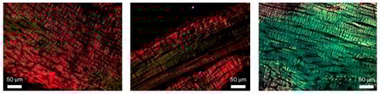 For the histological assessment of type I and III collagen fibers, Picrosirius Red staining was carried out, in which type I collagen stained red under illumination and type III collagen stained green.