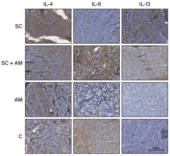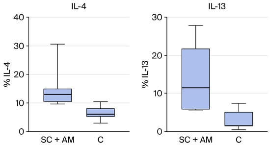 For these late-phase cytokines, IL-4 and IL-13 both showed significant differences between the groups; they were present at higher concentrations in the SC + AM group compared to the control group [27].