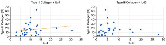 In the full dataset, IL-13 exhibits weaker correlations with the same collagen types (ρ = −0.35 for collagen I and ρ = 0.35 for collagen III; p = 0.057), but the directionality mirrors that observed for IL-4. This concordance reinforces the hypothesis that Th2-driven pathways may influence extracellular matrix remodeling by promoting a higher proportion of collagen III.