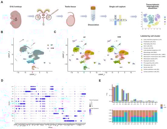 Characterization of mice testes by single-cell RNA sequencing. (A) Schematic illustration of the experimental workflow in this study. (B) Uniform Manifold Approximation and Projection (UMAP) plots of all testis cells from E16.5 WT and HOM mice (red = WT, blue = HOM). (C) All testis cells from E16.5 WT and HOM mice are colored according to their types (15 cell clusters). (D) Dot plot showing the expression levels of genes used for annotation in each cluster. (E) Bar plot showing the proportion of each subcluster in WT and HOM group. Created in BioRender. Ding, Y. (2025) https://BioRender.com/8ir7pef Accessed on 4 December 2025.
