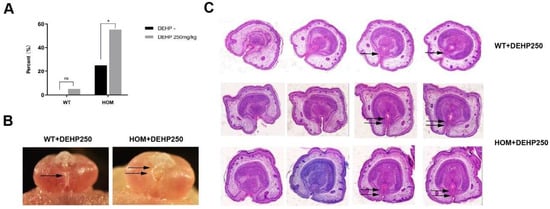 To model the interaction between genetic predisposition and environmental changes during pregnancy, we administered low-dose DEHP orally to pregnant mice. Our findings revealed that low-dose DEHP alone did not induce significant abnormalities in penile and urethral development. However, in DNAH8 knockout mice, low-dose DEHP markedly increased the incidence of urethral fusion defects at E16.5 (Figure 7A) and led to clear hypospadias phenotypes at E18.5 (Figure 7B,C).