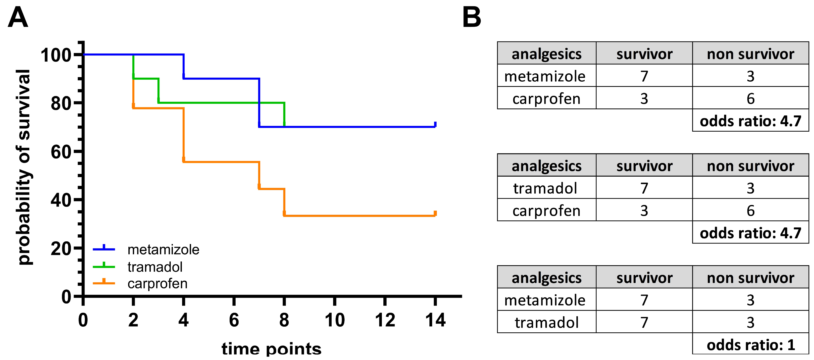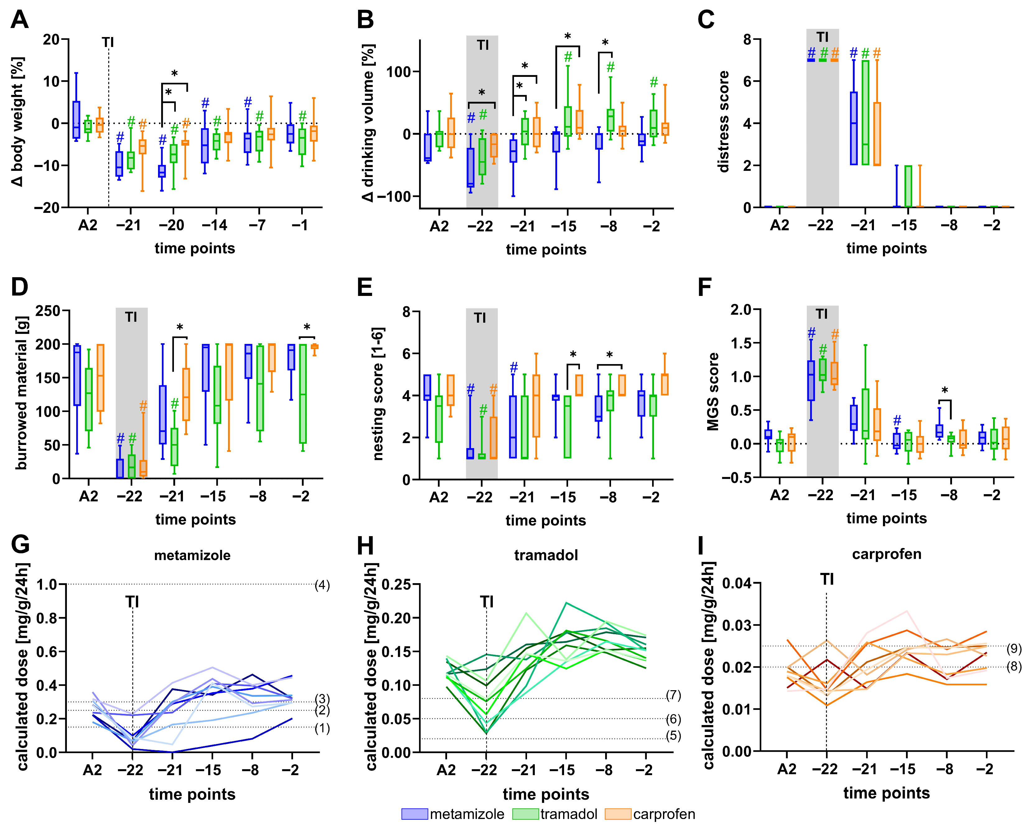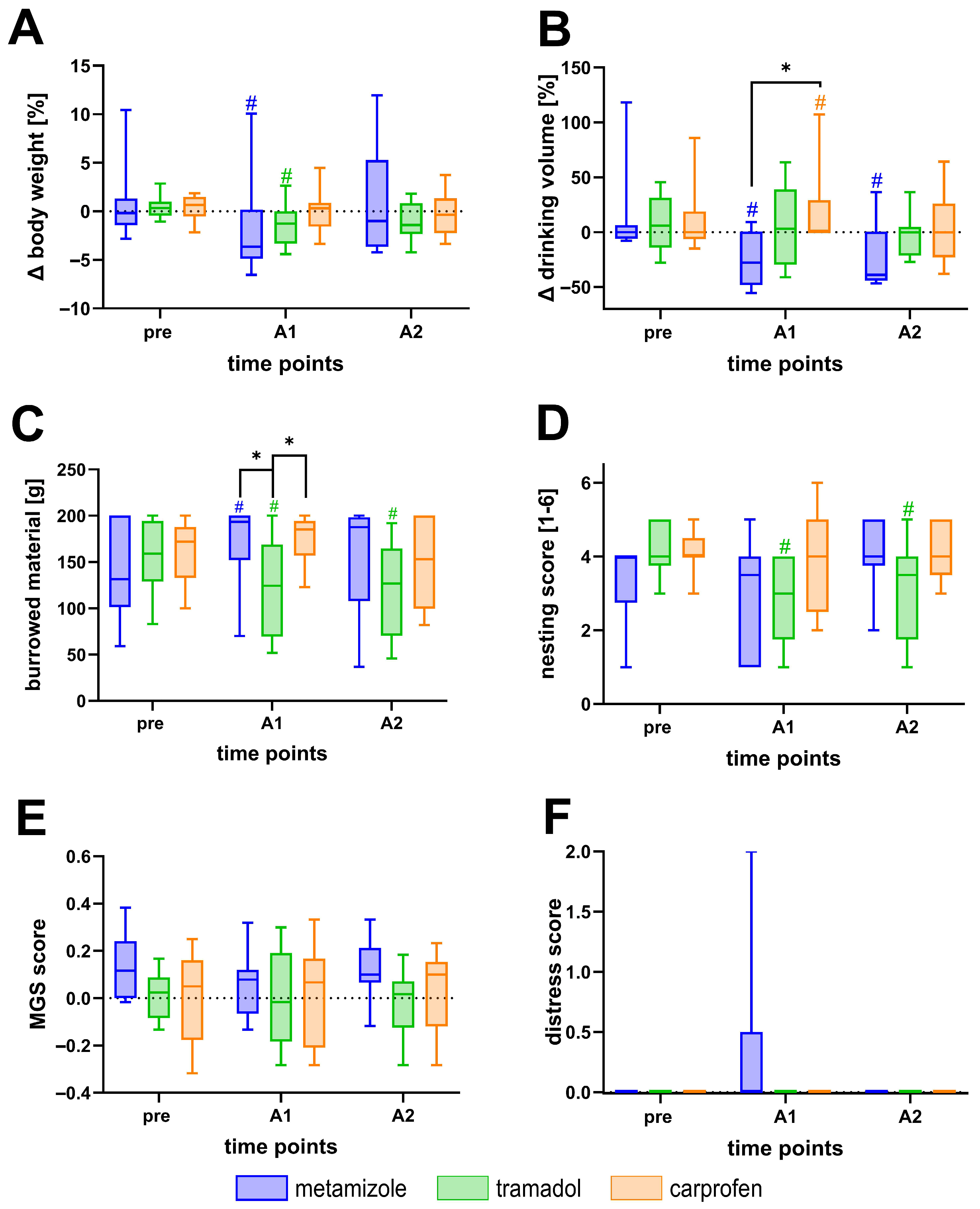 3.2. Metamizole Treatment Is Associated with the Lowest Postoperative Animal Welfare