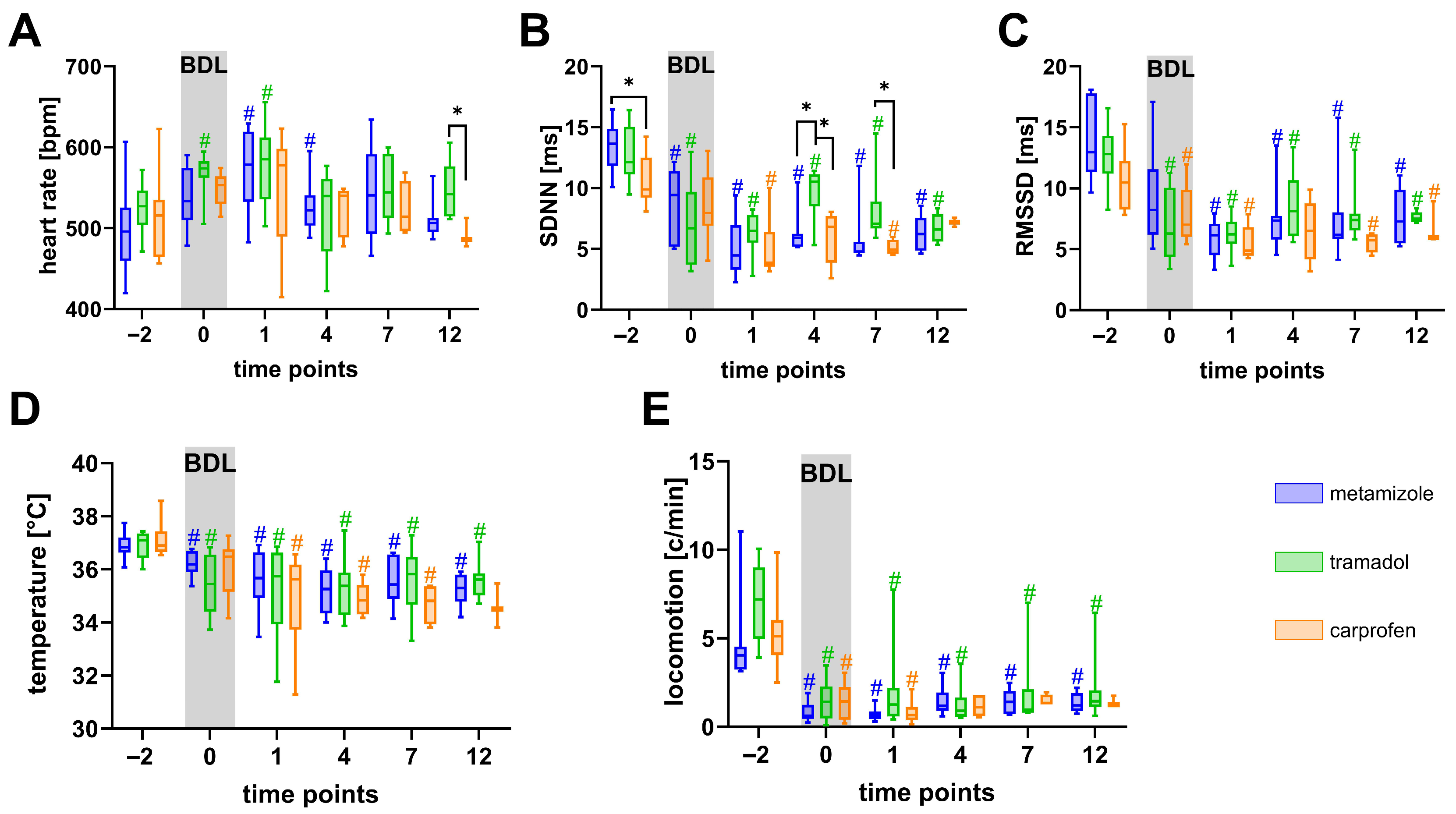 3.1. Effects of Metamizole, Tramadol, and Carprofen on Welfare Parameters in Healthy Mice