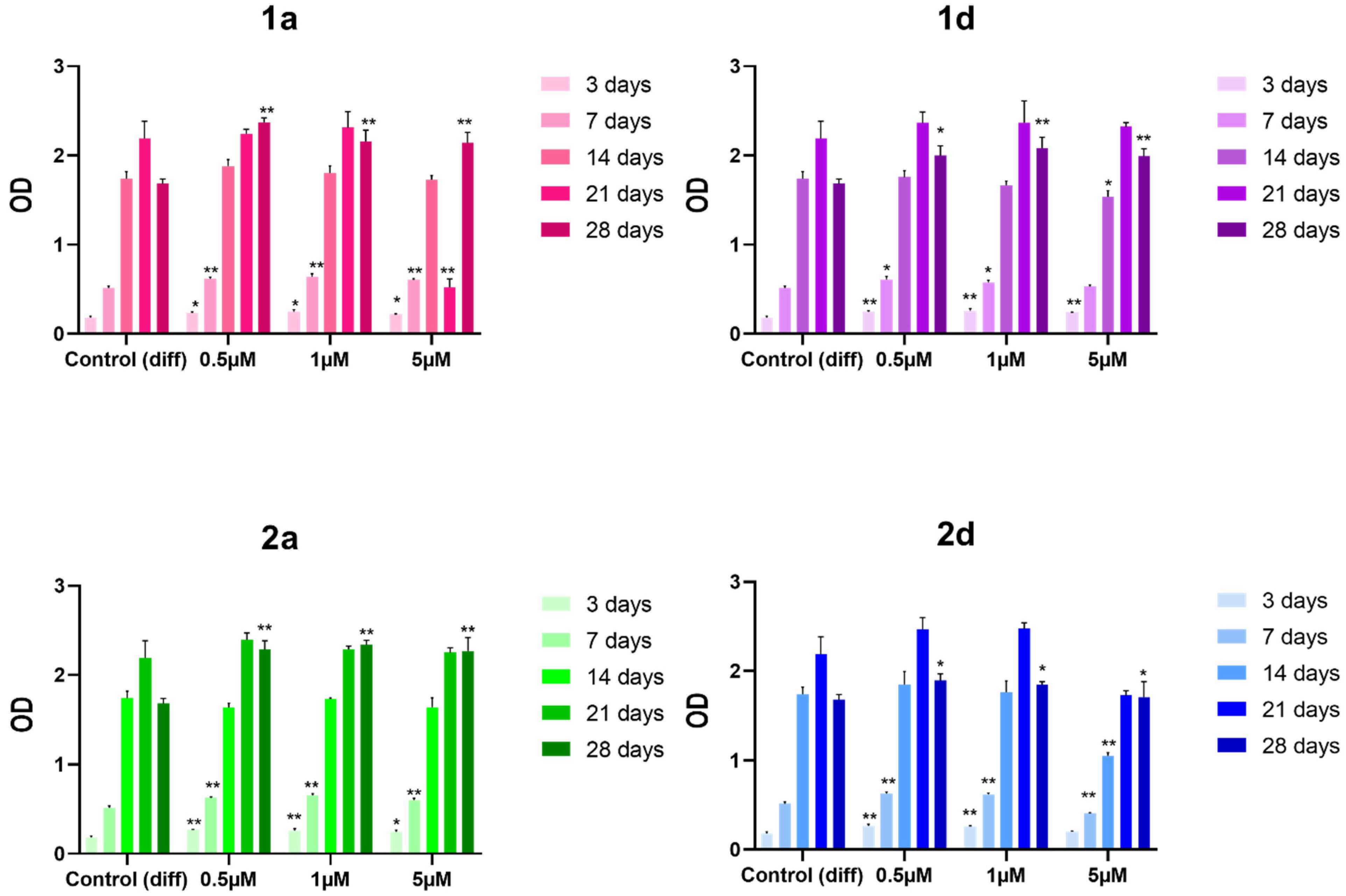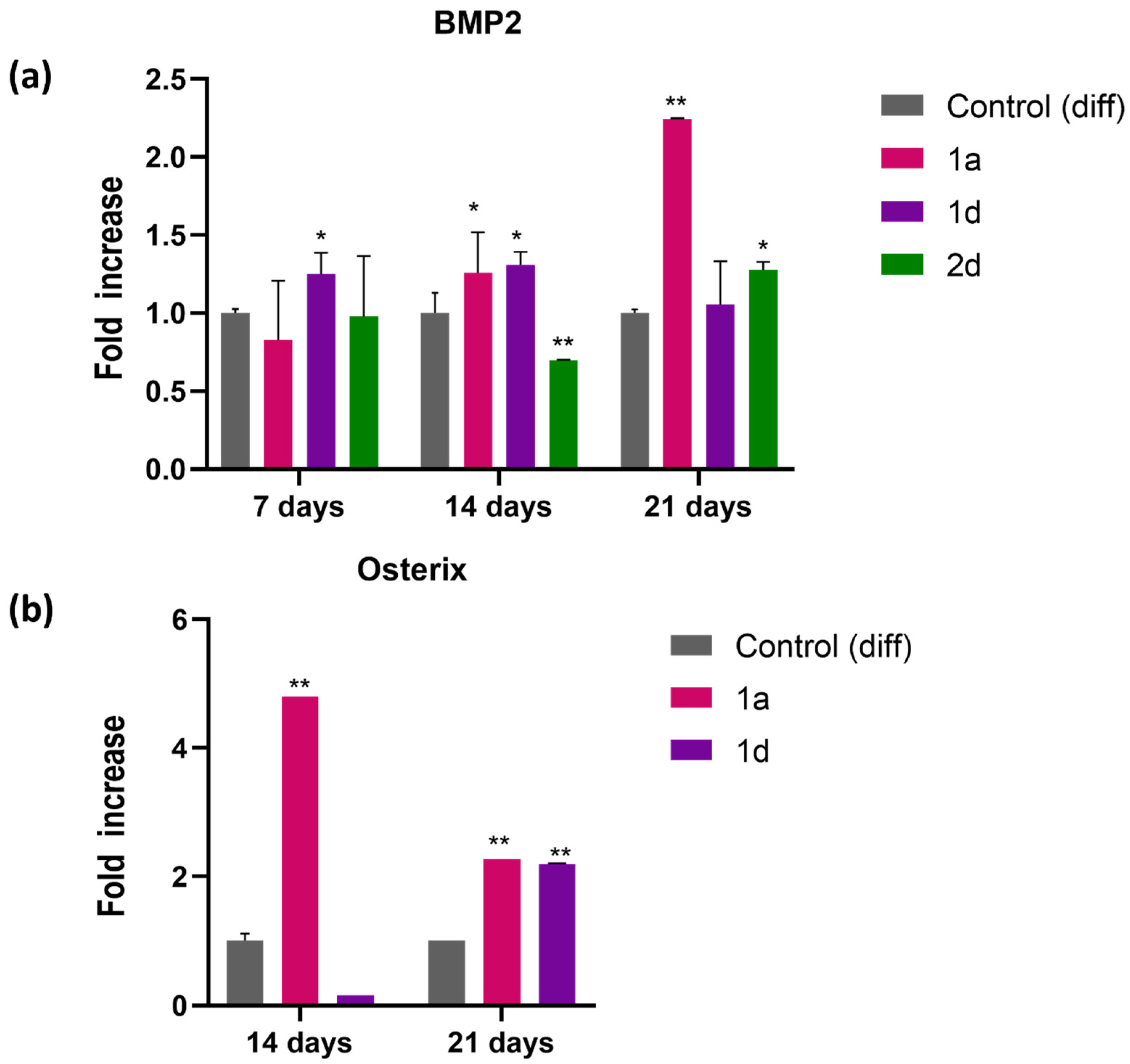 3.2. Bone Biomaterials Enriched with Compound 1a and 1d
