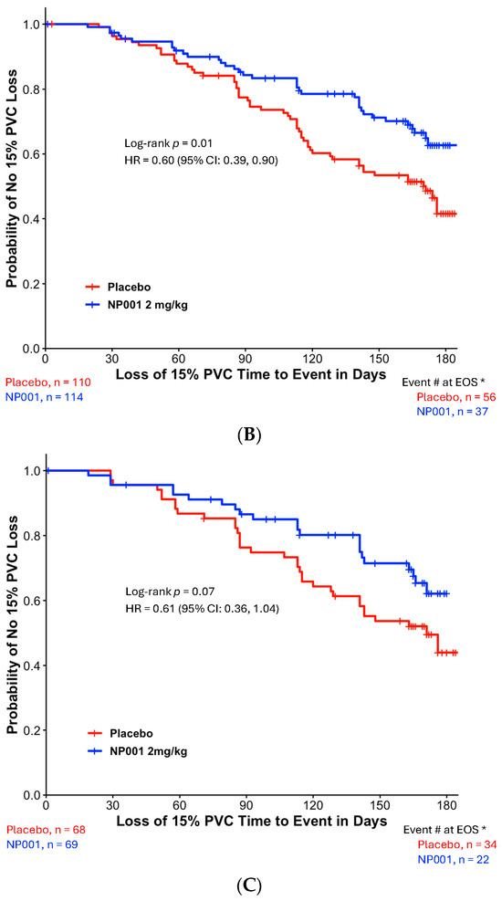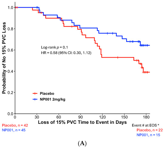 The time to 15% PVC loss between the NP001 2 mg/kg and placebo groups was statistically significant in the TTE analysis of the ITT population (Figure 1A). NP001 2 mg/kg treatment was associated with a significantly lower risk of treatment failure compared to placebo at 6 months (Log-rank test, p = 0.01 and Hazard ratio (HR) = 0.60, 95% CI: 0.39, 0.90).