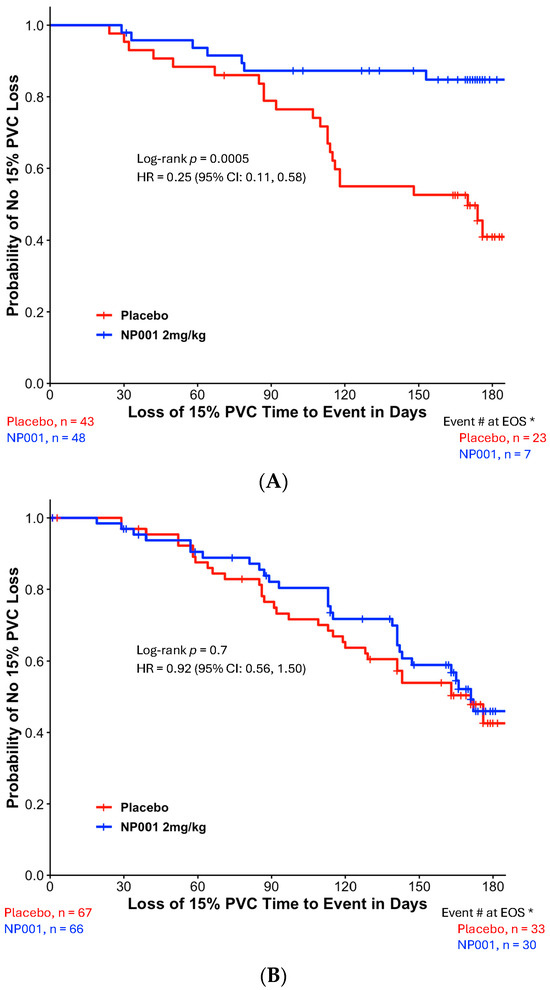 TTE of PVC change and OS differences by treatment/group were assessed using a log-rank test. Kaplan–Meier methods were used to estimate no 15% PVC loss and survival probabilities and curves. Cox-proportional hazards models were used to estimate the hazard ratio associated with ≥ 15% PVC loss or dying for patients treated with NP001 compared with those given a placebo. The assumptions of proportionality of hazards over time were assessed using the Schoenfeld test. Patients who did not lose 15% PVC over the 6-month trial period were considered censored in the %PVC change TTE analyses.