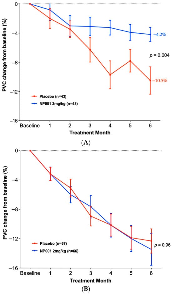Comparison of PVC change from baseline by slowly and rapidly progressive ALS over the six-month NP001 phase 2 studies. (A) Participants with DPR < 0.50 ALSFRS-R score lost/month treated with NP001 experienced a slower PVC loss compared to placebo. PVC change from baseline for participants treated with NP001 (blue, n = 48) is compared to the placebo group (red, n = 43). Error bars represent the range, mean ± SEM (standard error of the mean) of PVC change from baseline. Average PVC lost over the 6 months of study: NP001: −4.2% (−0.7% per month); placebo: −10.5% (−1.75% per month). The NP001 treatment group showed a 60% slower PVC loss by the end of the study (Wilcoxon test, p = 0.004). (B) PVC change from baseline over the six-month study of participants treated with NP001 compared to placebo in rapidly progressive ALS (DPR ≥ 0.50 ALSFRS-R score lost/month). PVC change from baseline for participants treated with NP001 (blue, n = 66) compared to the placebo group (red, n = 67). Error bars represent the range, mean ± SEM of PVC change from baseline (Wilcoxon test, p = 0.96). No differences were seen between NP001 and placebo groups by the end of the study (NP001 = − 13.5% vs. Placebo = −12.3%) (Wilcoxon test, p = 0.96).