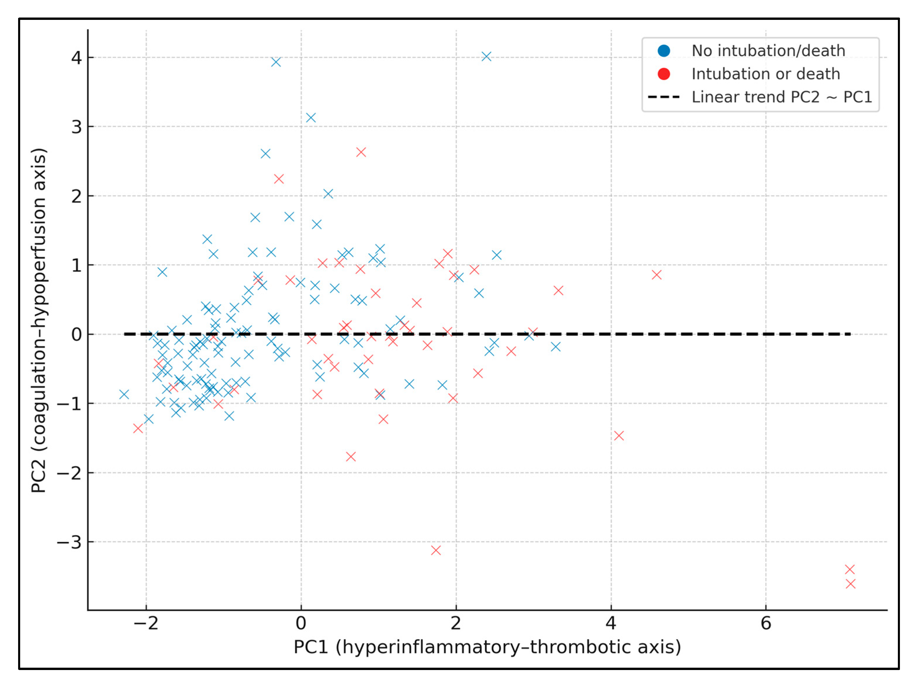 Figure 1 shows PC1 (hyperinflammatory–thrombotic axis) vs. PC2 (coagulation–hypoperfusion axis), with patients colored by the composite endpoint (blue = no intubation/death, red = intubation or death). A dashed linear trendline summarizes the relationship between PC1 and PC2 (slope ≈ 0.31, intercept ≈ 0.02), indicating that higher PC1 values tend to coincide with higher PC2 values, i.e., patients with more global hyperinflammation also have somewhat more pronounced coagulation–hypoperfusion features. Patients with events are predominantly located at higher PC1 values (and, to a lesser extent, higher PC2 values), particularly for PC1 values above roughly +1 SD, consistent with the tertile analysis where event rates rose from 7.4% in the lowest PC1 tertile to 57.4% in the highest.