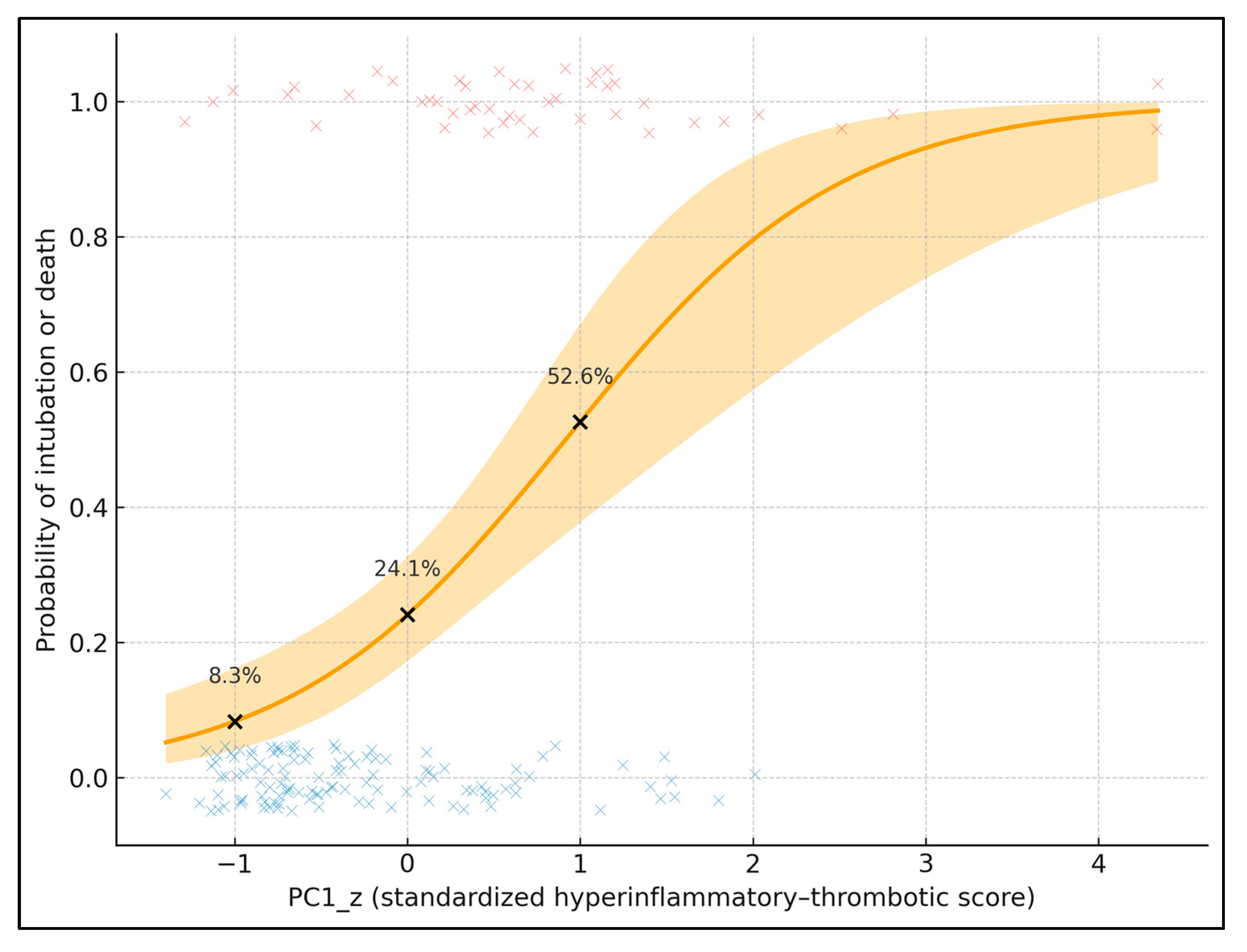 Figure 2 plots the predicted probability of the composite endpoint (intubation or death) against standardized PC1 (PC1_z), adjusted for age and lung involvement. The solid curve is the fitted logistic regression; the shaded band represents the 95% confidence interval, and individual patients are overlaid as jittered points (red = event, blue = no event). To provide explicit data labels, three black points mark PC1_z = −1, 0, and +1, annotated with their predicted probabilities: 8.3% at PC1_z = −1, 24.1% at PC1_z = 0, and 52.6% at PC1_z = +1 (for a 67-year-old with median lung involvement). These values quantify the steep risk gradient along PC1_z. In the underlying model, each 1-SD increase in PC1_z is associated with an odds ratio of 3.50 (95% CI 2.05–5.99) for intubation or death, showing that this latent hyperinflammatory–thrombotic score is a strong, continuous prognostic marker.