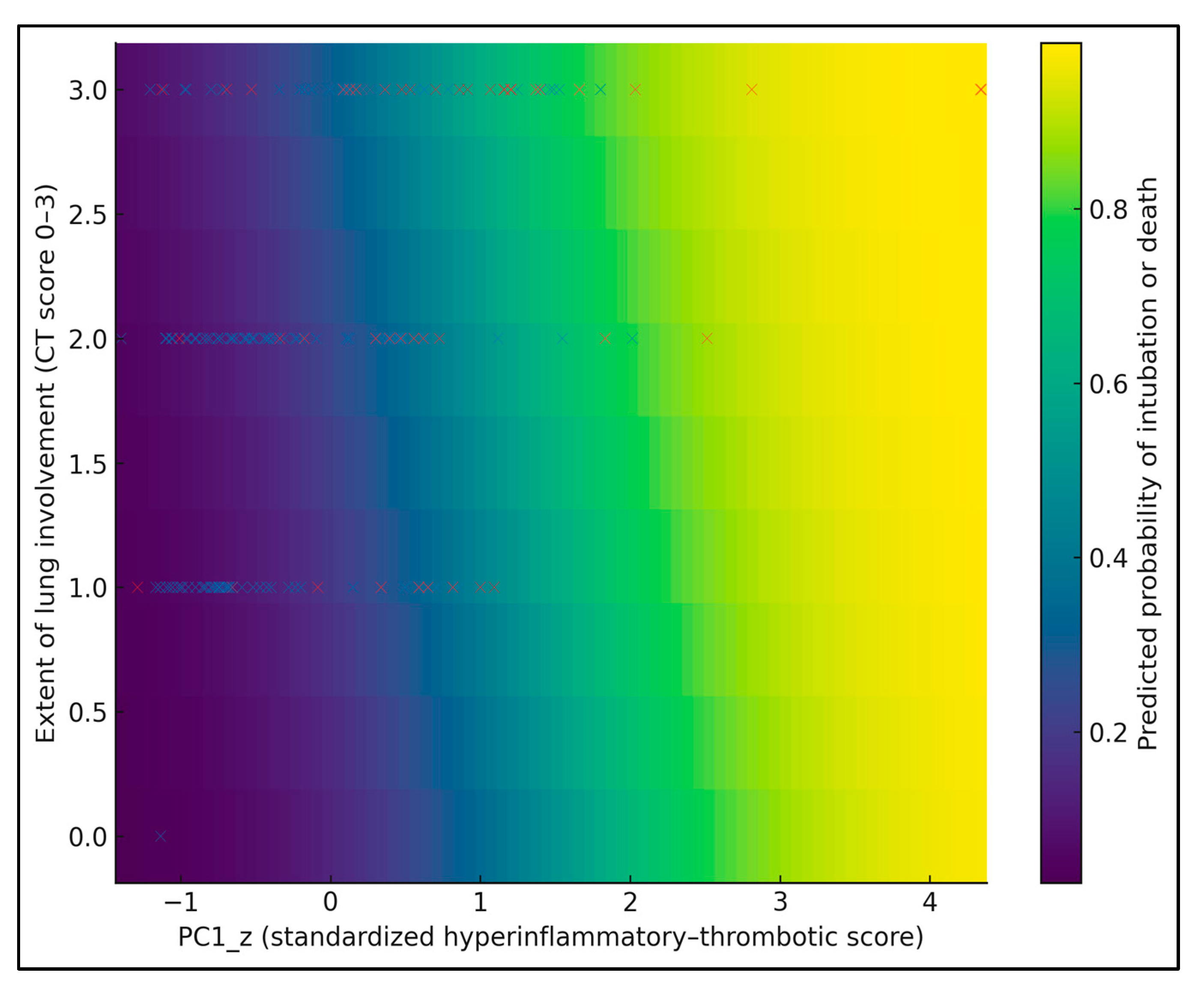 Figure 3 provides a 2D heatmap of the predicted probability of intubation or death as a joint function of PC1_z (x-axis) and CT lung involvement score (0–3 on the y-axis), with age fixed at the cohort median (67 years). Warmer colors indicate higher predicted risk, and overlaid dots show observed patients (blue = no event, red = event). The risk surface is clearly non-linear: at low PC1_z (≈−1), predicted risk remains below 15% even at lung involvement 3, whereas at high PC1_z (≈+1.5), risk exceeds 60–70% once lung involvement reaches ≥ 2. For example, a patient with PC1_z ≈ 0 and lung score 1 has an estimated risk around 20–25%, while one with PC1_z ≈ +1.5 and lung score 3 approaches 70–75%.
