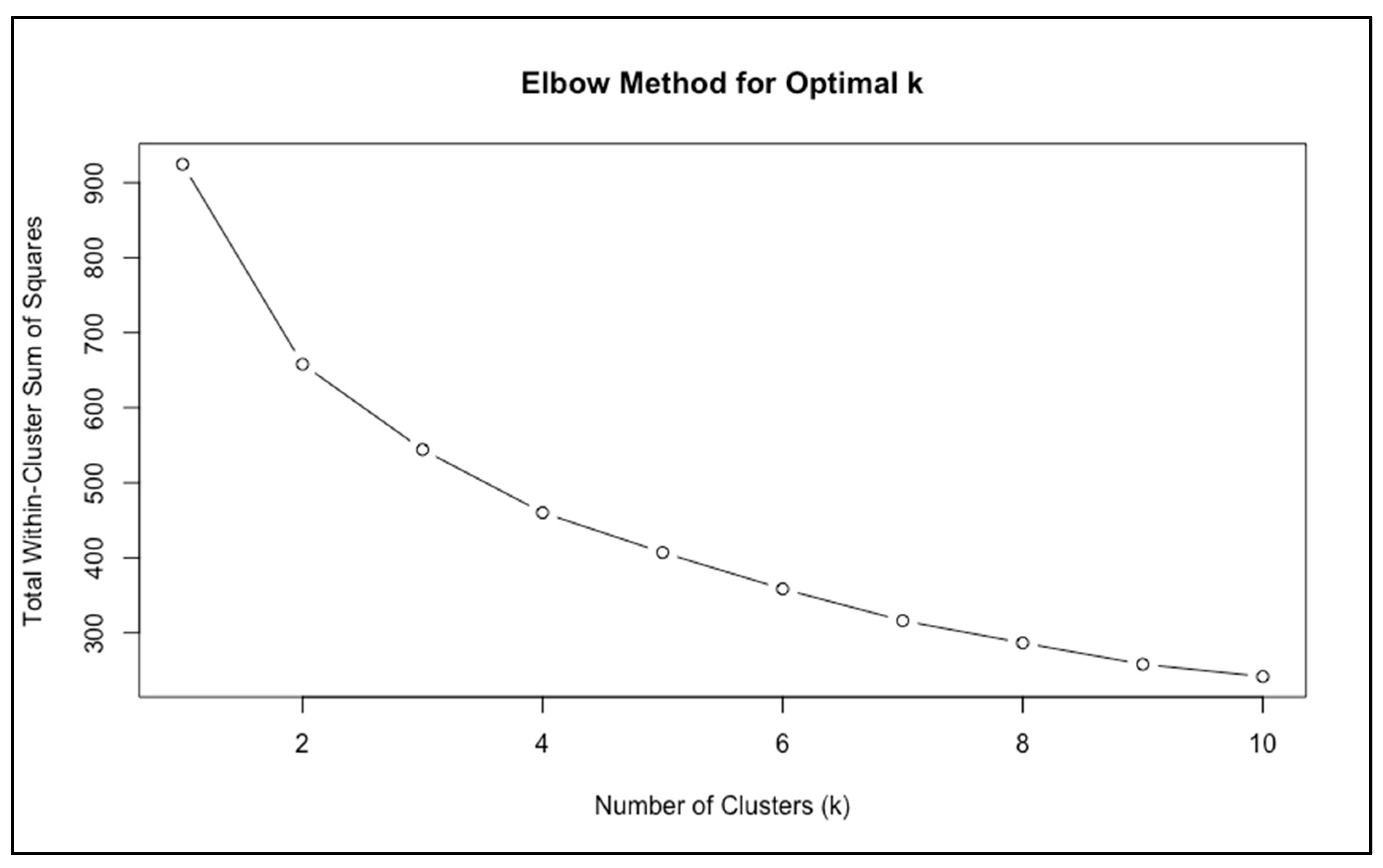 The elbow method suggested that a two-cluster solution was most appropriate, as the curve displayed a clear inflection at
