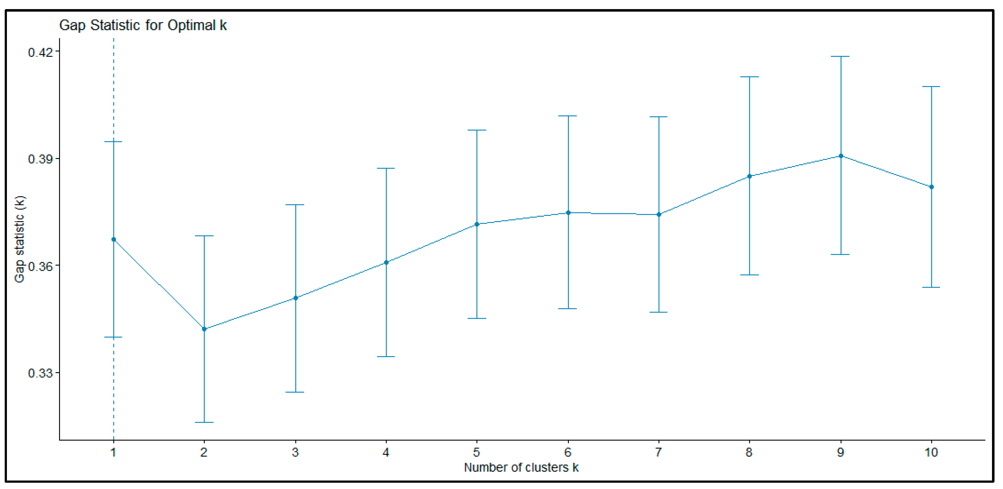 k = 1 as the most conservative solution, reflecting the modest sample size and some overlap in sexual function scores. However, closer inspection of the gap curve revealed a dip at