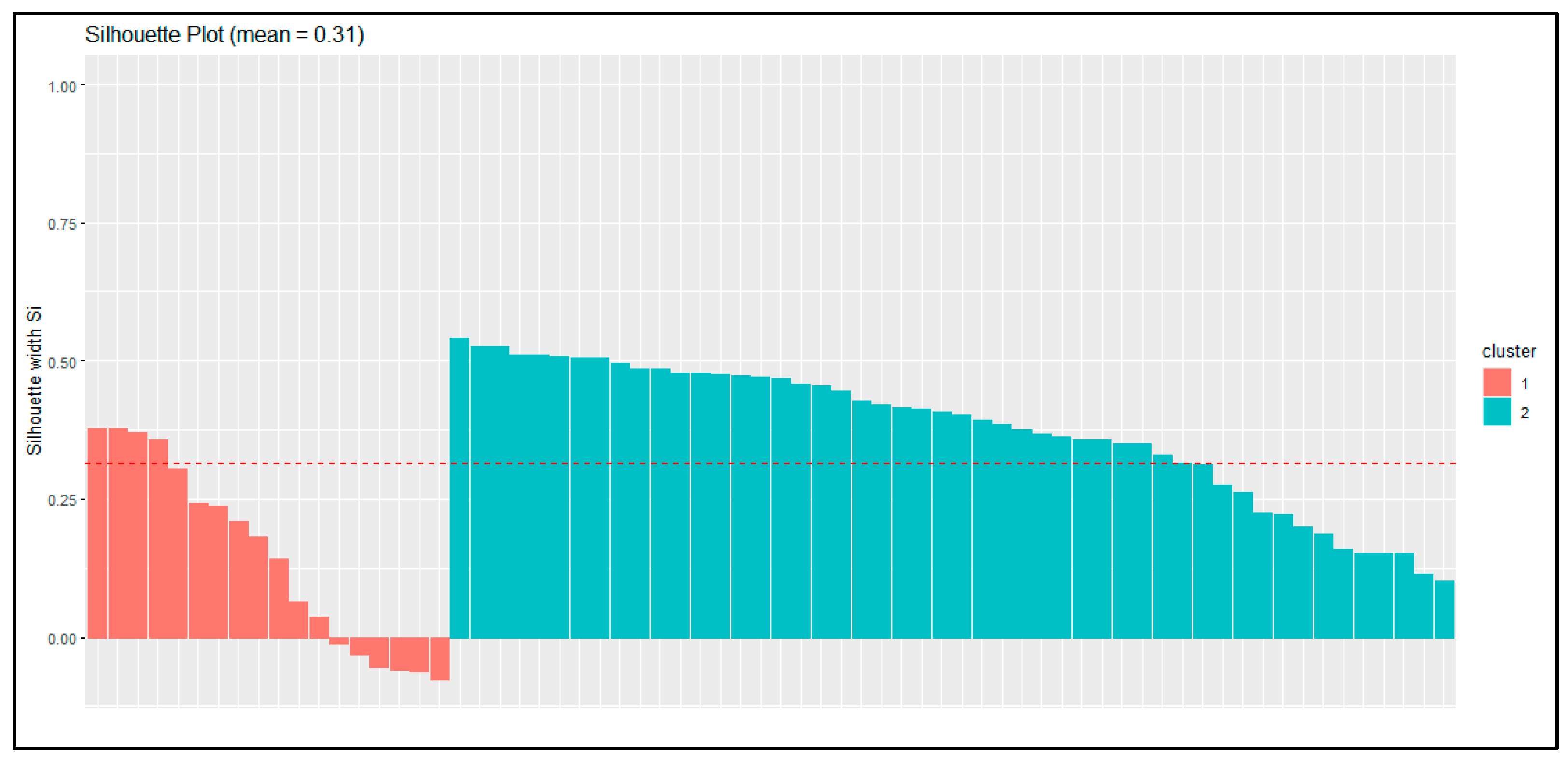 Figure 3) indicated moderate separation overall (mean coefficient = 0.31). The first cluster showed lower internal cohesion (average silhouette = 0.14), whereas the second cluster was more compact and internally consistent (0.38). This pattern suggests that one group was more heterogeneous in its sexual function scores, while the other was more uniform.