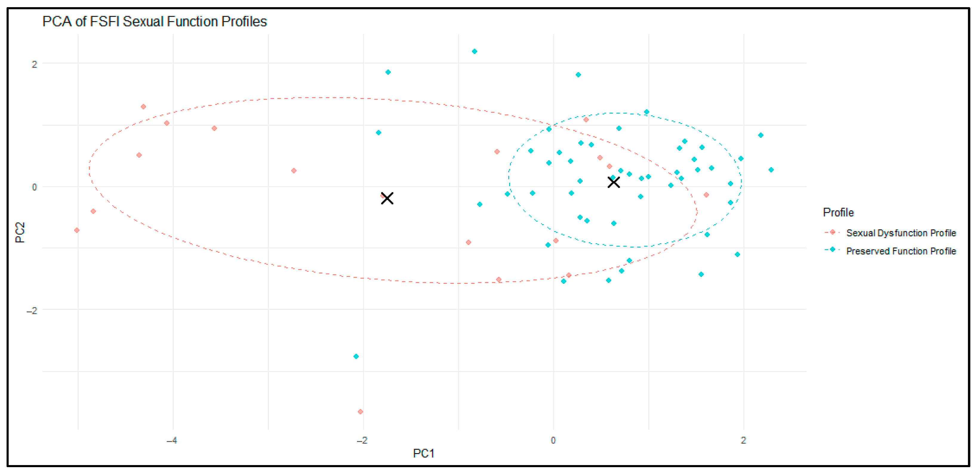 To further examine the structure of the two-cluster solution, we performed a principal component analysis (PCA) on the six FSFI domains. PCA reduced the multidimensional data into two principal components that together captured the majority of the variance in sexual function profiles.