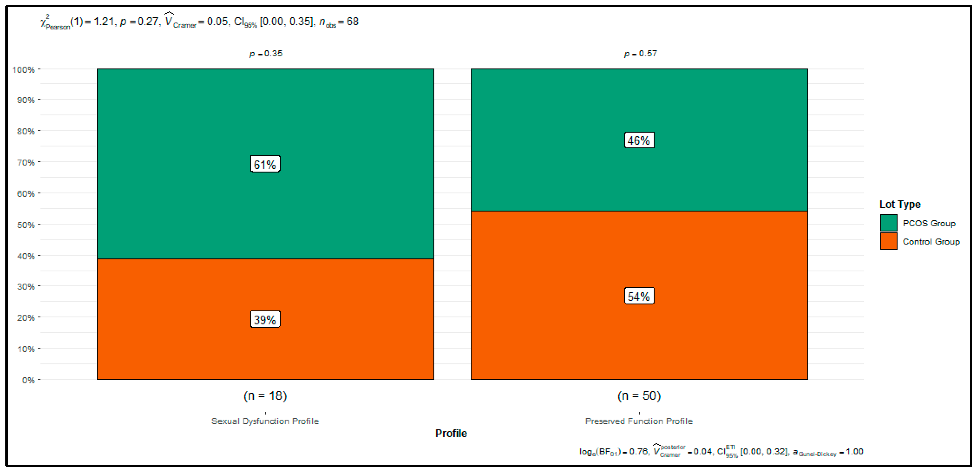 Figure 5). Women with PCOS were more frequently classified into the Sexual Dysfunction Profile (61% vs. 39%), whereas controls were somewhat more likely to belong to the Preserved Function Profile (54% vs. 46%). This difference, however, did not reach statistical significance (χ