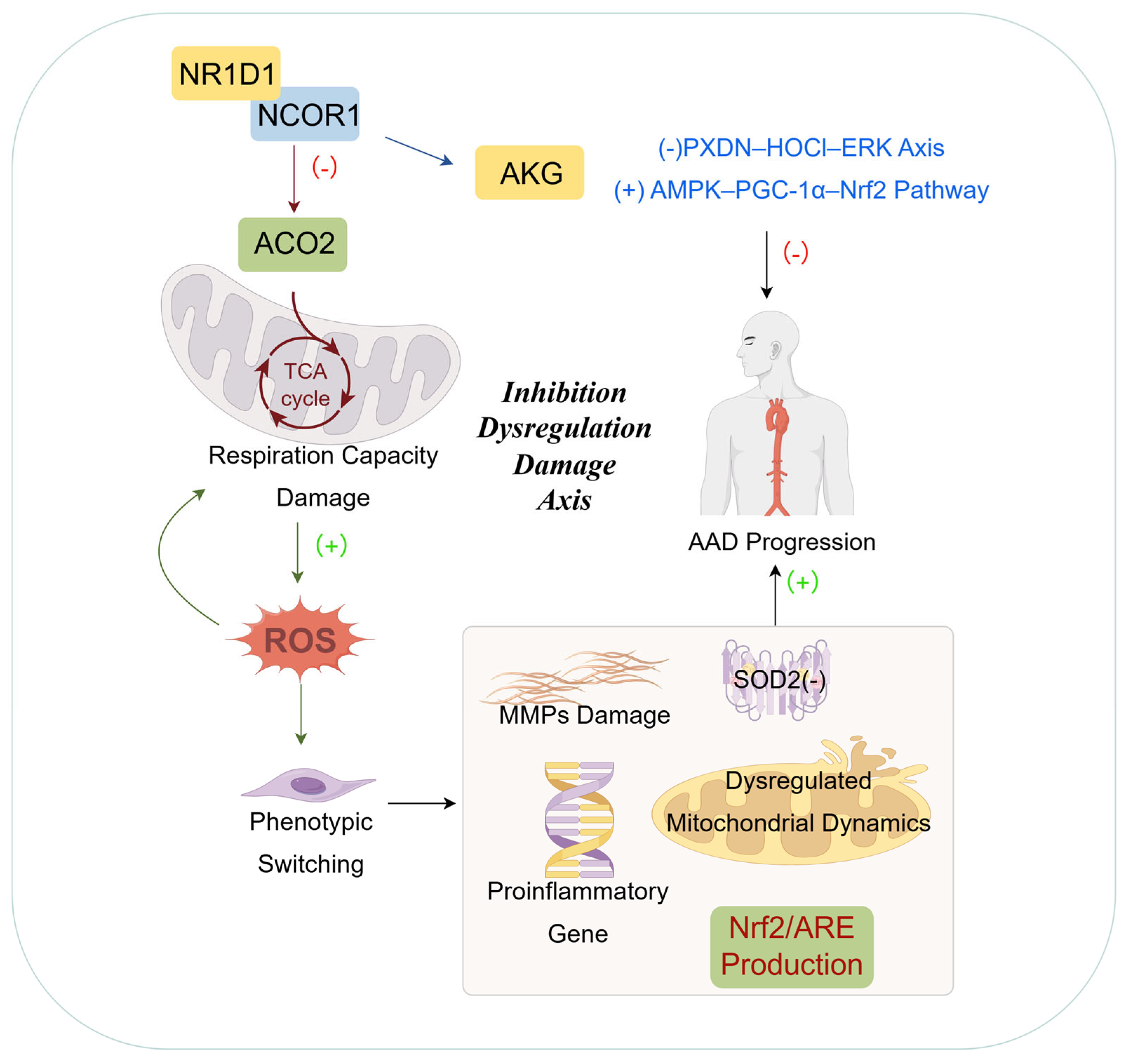 - Sun, L.-Y.; Lyu, Y.-Y.; Zhang, H.-Y.; Shen, Z.; Lin, G.-Q.; Geng, N.; Wang, Y.-L.; Huang, L.; Feng, Z.-H.; Guo, X.; et al. Nuclear receptor NR1D1 regulates abdominal aortic aneurysm development by targeting the mitochondrial tricarboxylic acid cycle enzyme aconitase-2. Circulation 2022, 146, 1591–1609. [Google Scholar] [CrossRef]