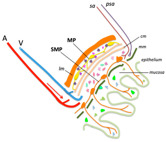 Main structures and cells of healthy ileum and colon wall. A, artery; V, vein; lm, longitudinal muscle; SMP, submucosal plexus; MP, myenteric plexus; sa, sympathetic axon; psa, parasympathetic axon; cm, circular muscle; mm, muscularis mucosa. Enteric glial cells (EGCs) are figured as small multicolored cells distributed across all layers of the intestinal wall.