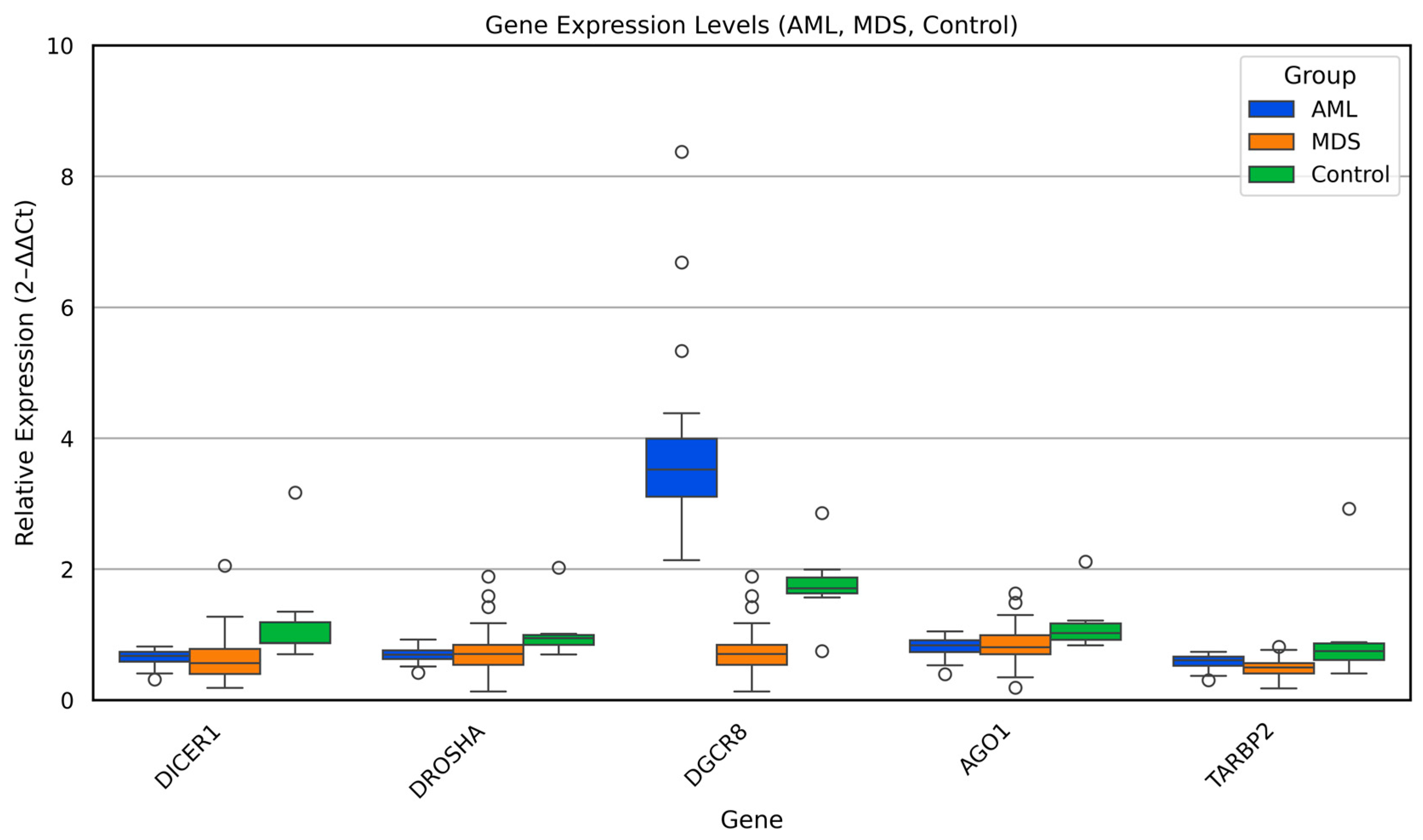 Despite such evidence, most existing studies have evaluated these genes individually or within cell-based systems that lack clinical context. Comprehensive assessments integrating multiple miRNA biogenesis genes in human MDS and AML cohorts remain scarce. This study therefore examined the expression of DROSHA, DGCR8, DICER1, TARBP2, and AGO1 in bone marrow samples from untreated patients with MDS and AML, compared with healthy controls. Through combined expression, correlation, and diagnostic analyses, we aimed to determine whether concurrent alterations in the miRNA processing machinery might represent a shared molecular signature of myeloid transformation and possibly provide a framework linking defective biogenesis to the continuum between dysplasia and leukemic progression.