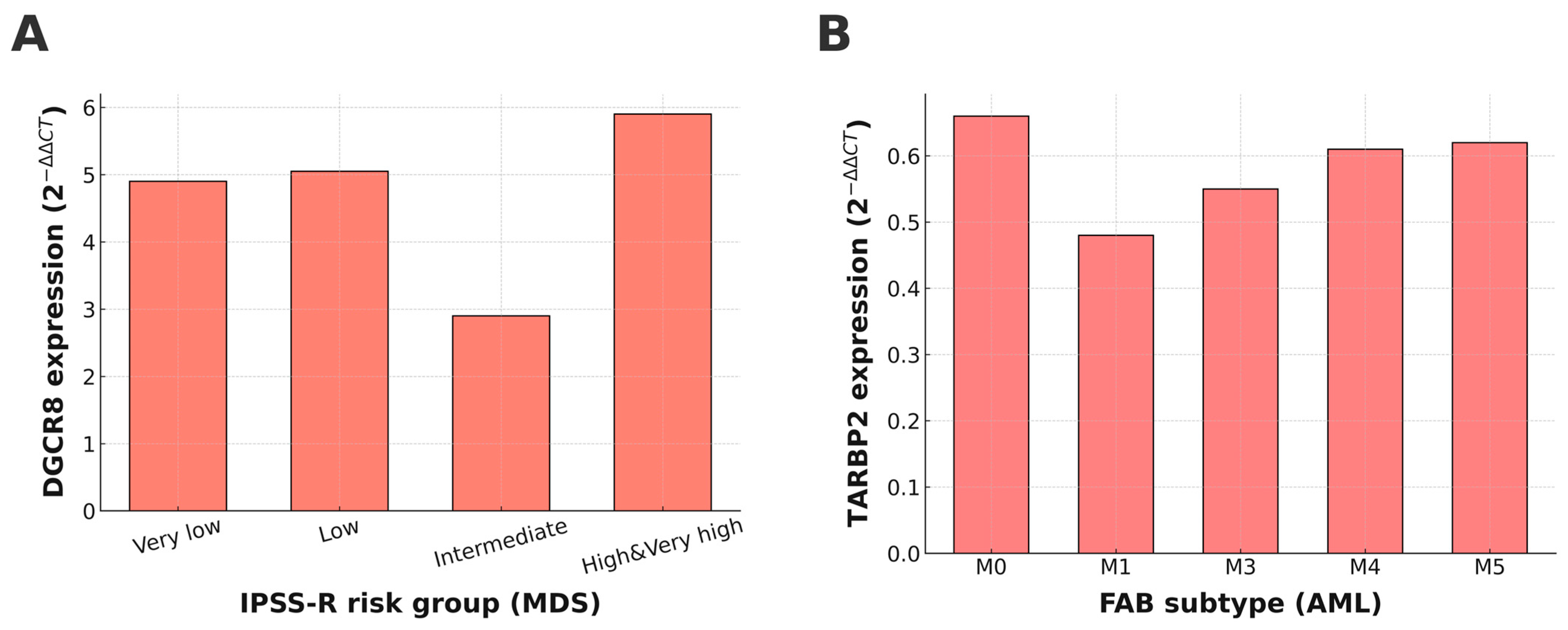 These findings indicate that while most miRNA biogenesis genes exhibit stable expression across clinical subgroups, DGCR8 in MDS and TARBP2 in AML display disease-related transcriptional alterations that may be linked to disease severity or differentiation status.