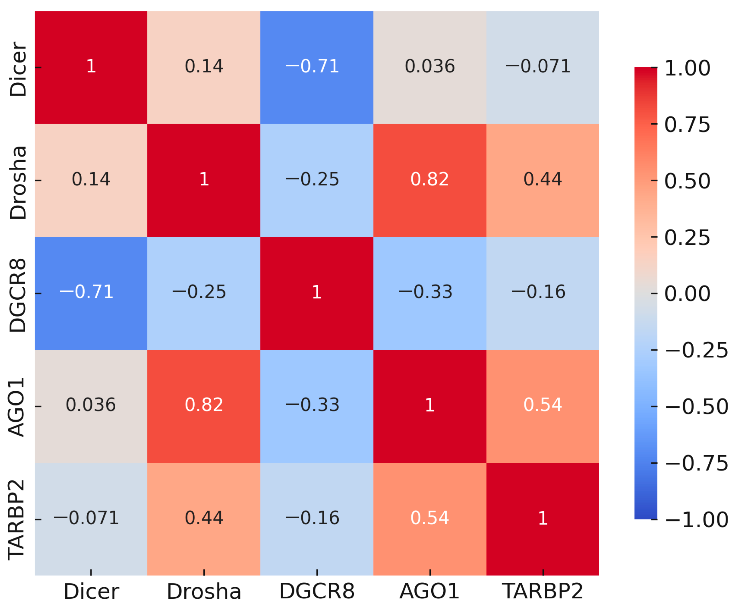 21]. Correlation analysis further supported a coordinated behavior among DROSHA, TARBP2, and AGO1, indicating a partially preserved cytoplasmic processing module despite upstream disruptions in DROSHA and Dicer. However, these correlations represent associative patterns only and should not be interpreted as evidence of direct causal relationships between gene dysregulation and disease status. Its stable expression may reflect partial preservation of RISC activity despite upstream impairment, although this interpretation remains speculative without functional validation.