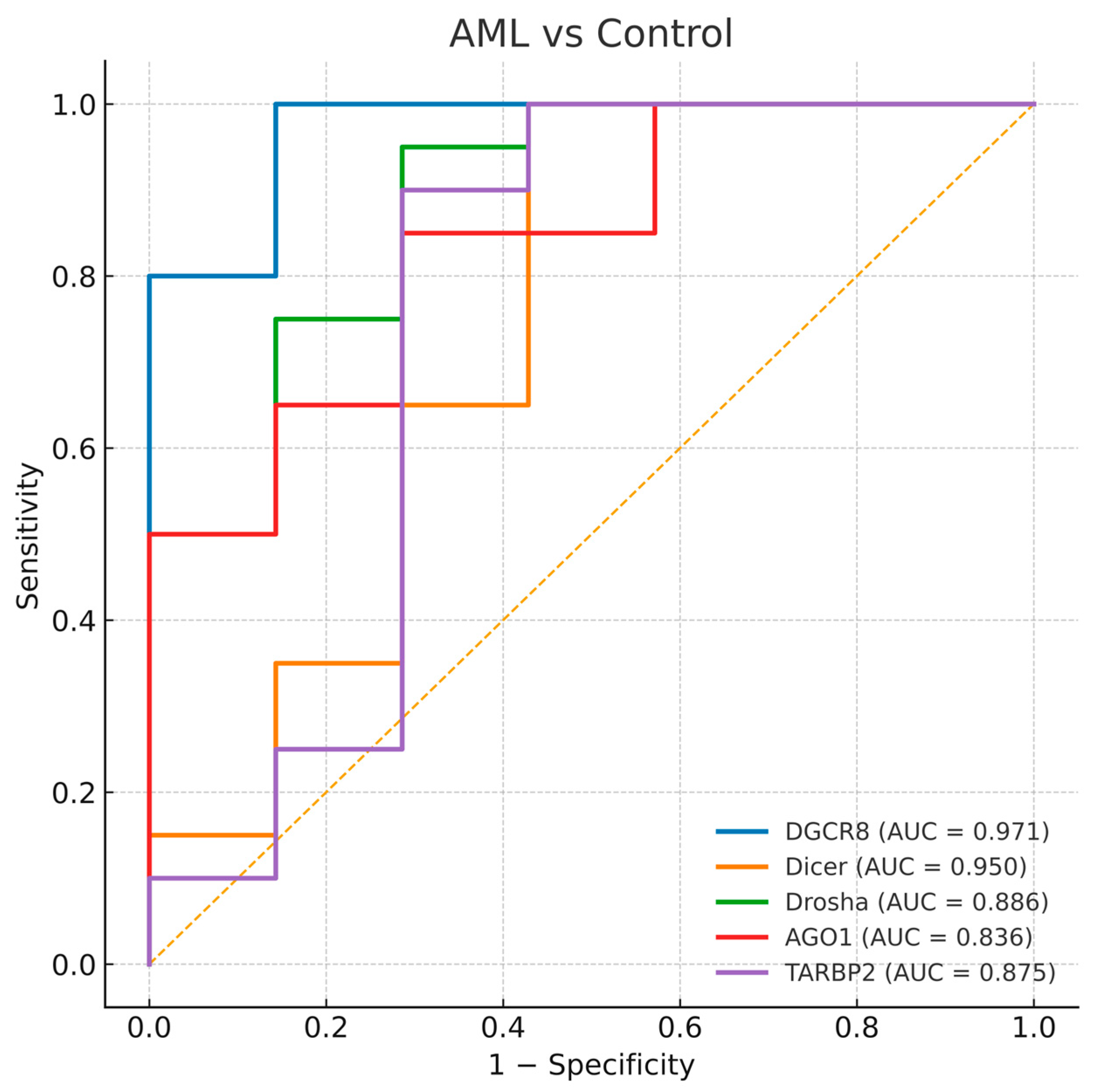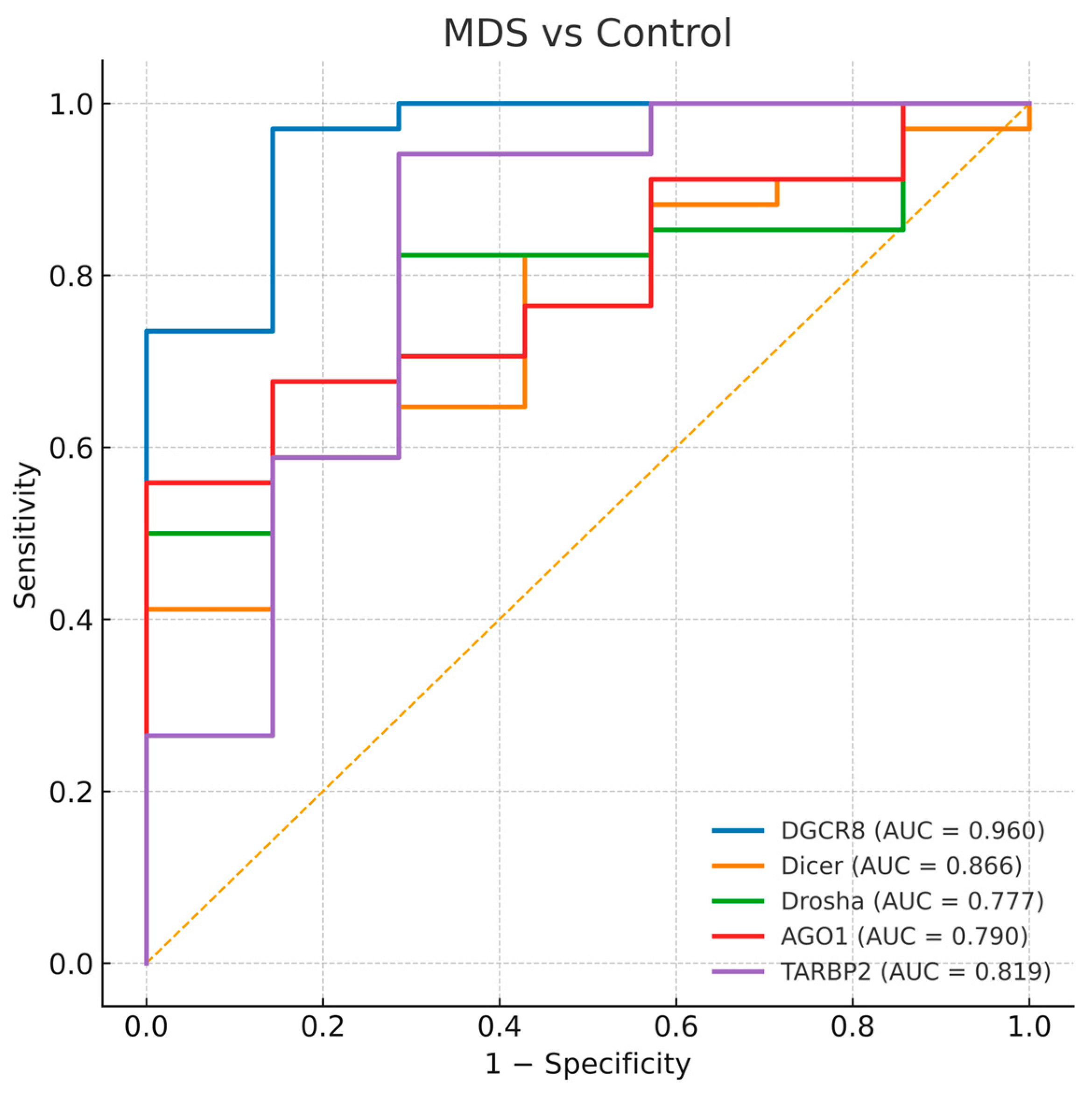 DGCR8 emerged as key biomarkers, with strong diagnostic discrimination between patients and controls. The ROC analyses revealed high sensitivity against controls, indicating that these genes may serve as useful biomarkers for distinguishing patients from healthy individuals; however, they do not demonstrate discriminatory power between AML and MDS [
