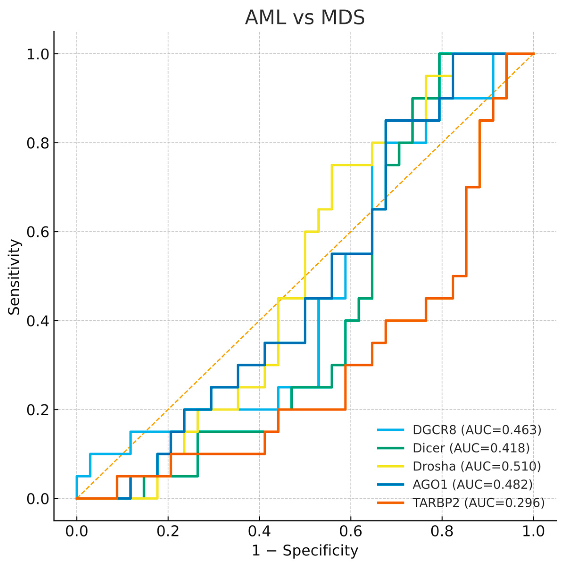 To investigate whether these genes could discriminate between AML and MDS, an additional ROC analysis was performed. None of the five genes demonstrated meaningful discriminative ability between the two diseases, with AUC values close to 0.5 for